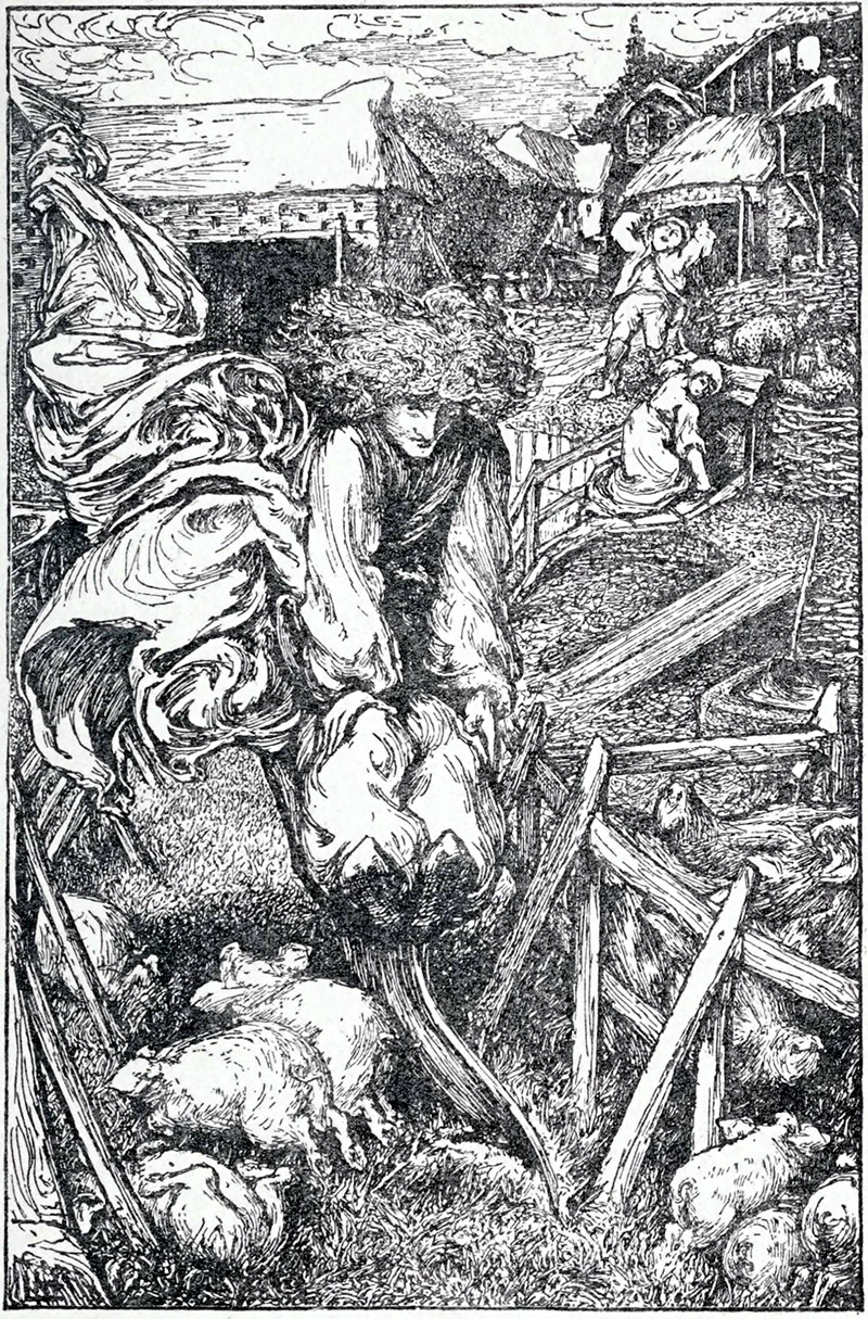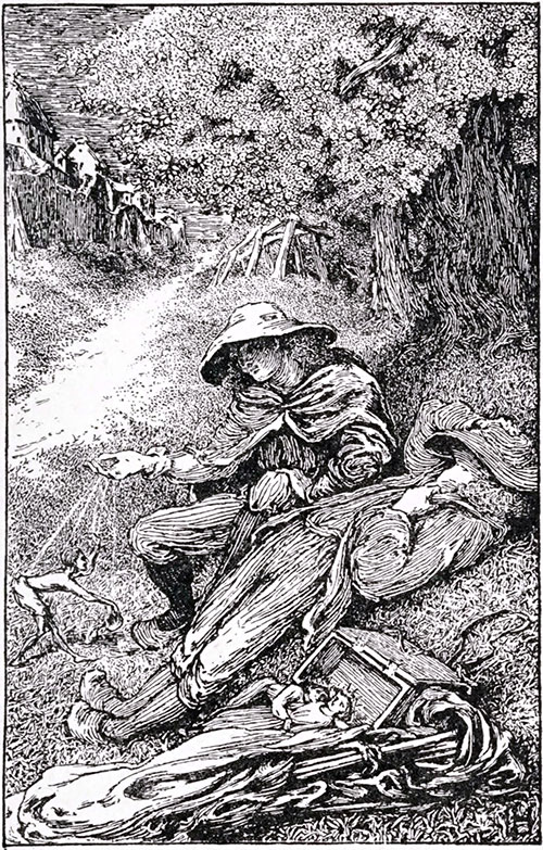 Presently he began dreaming to himself like Jacob, only his dream was just of the simple things of earth. Down the great green uplands came troops of white cattle; but to him they seemed to be bridesmaids coming to Grendel’s wedding day, and the ringing of the cow-bells was as sweet to him as the songs of angels. Before he was fast asleep the two marionettes had slipped off his knee and lay in the deep grass looking up at the sky.
