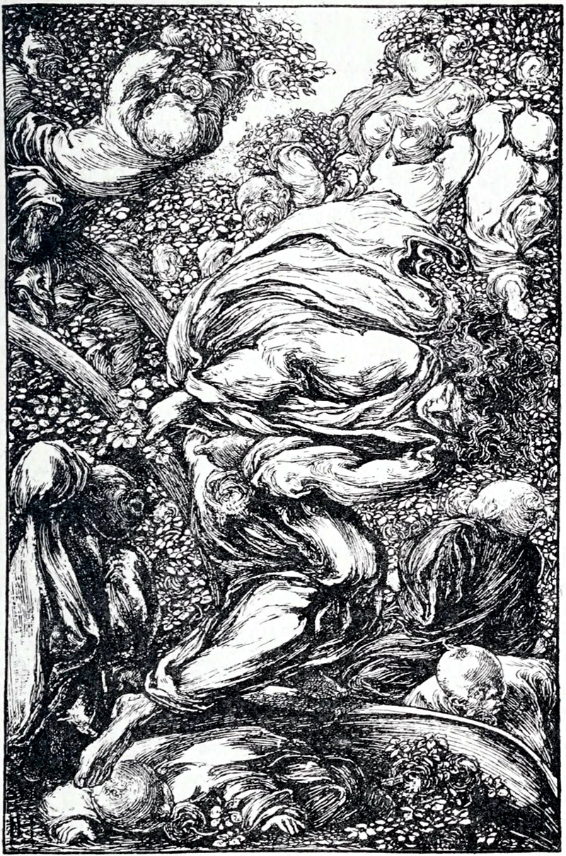 He ran tottering over the marble pavement, as fast as fear would send him; to get away out of the palace and fetch help for all these dead or dying people: for there must still be somebody left somewhere. But when he came to the porter’s lodge, there was a sight in the wicket that stopped him: the small square aperture was bulged through by thistle and bramble, in the midst of which his little shoe hung trussed and skewered; the hard grasp of the thistles had bent it out of shape, and the thorns of the bramble had cut into the leather like the steel teeth of a trap. Looking through, he could see nothing but one dense forest of thistles, made the more impassable by a thick mesh of creepers that clung about their stems. He climbed up on to the walls: [Pg 215]everywhere was the same; those death’s heads of hemlock had grown higher than the trees of the park, and threw their shadows over the whole palace.
