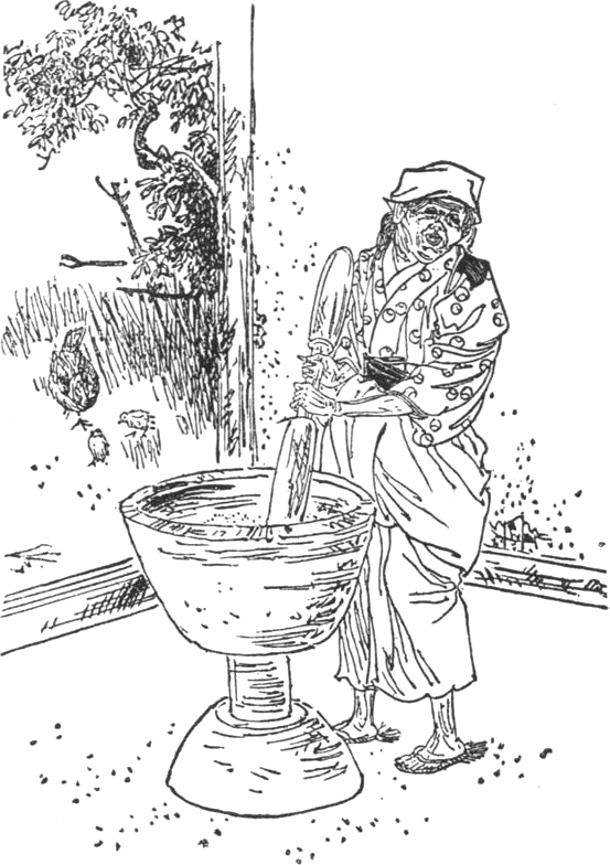 Boldog ember lett a fösvény s cserepeket, megannyiját összeszedvén, nagysietvést lohol haza, szinte ragyog örömében Jamagáta kapzsi arca. Végignézi cserepét és férjurát is felesége, féloldalt néz, gyanúperes a nézése.