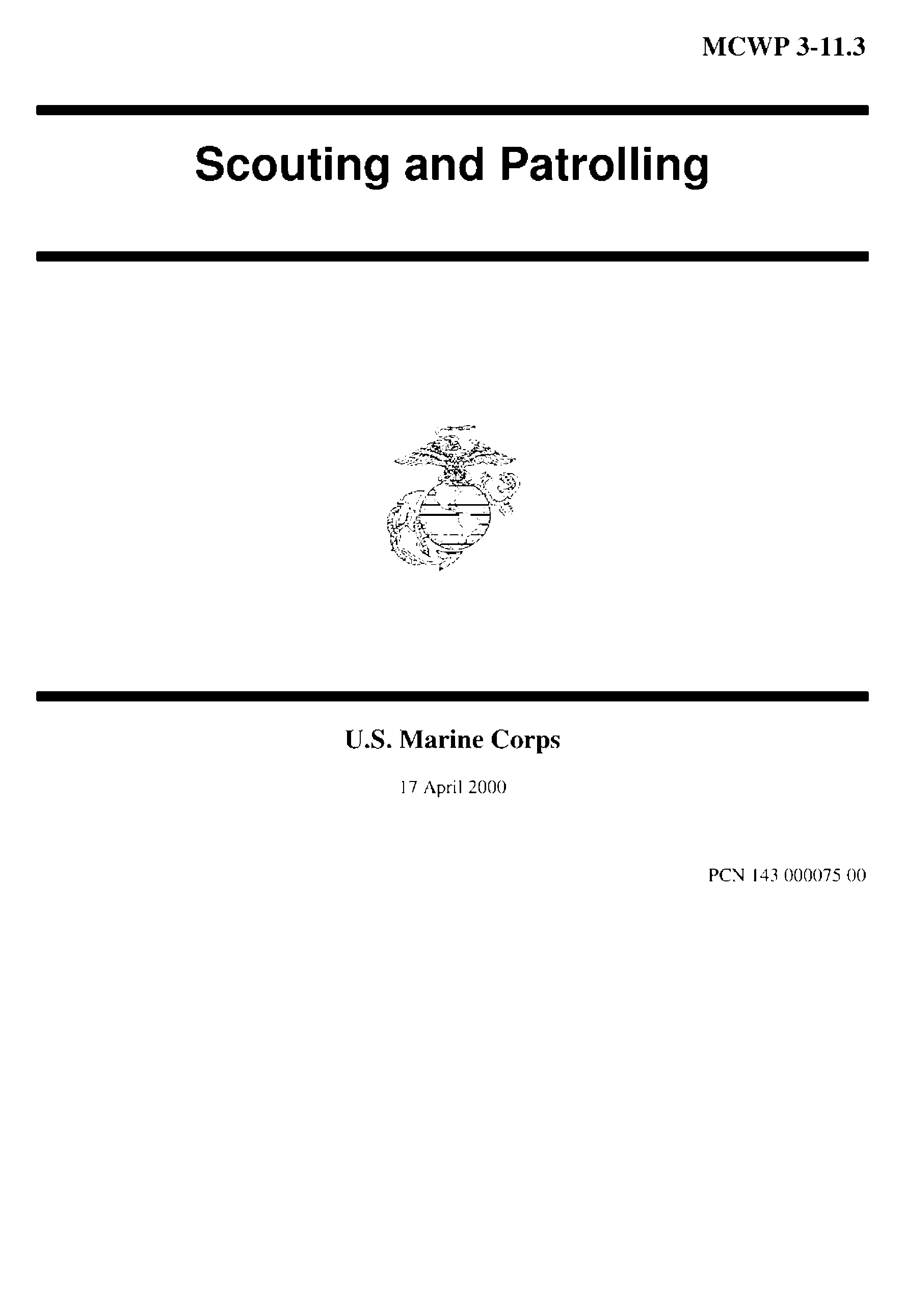 Marine Corps Warfighting Publication (MCWP) 3-11.3, Scouting and Patrolling, provides the doctrinal foundation and the tactics, techniques, and procedures for scouting and patrolling conducted by Marines from the fire team to the company level. Although the information focuses on infantry units, much of the information is also applicable to combat support units that are assigned patrolling missions.