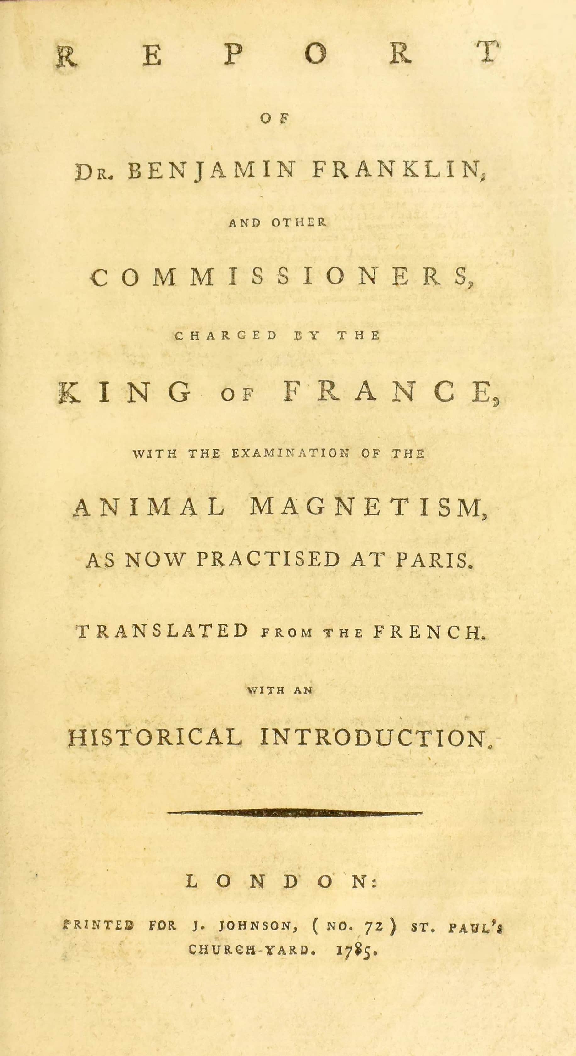 Title: Report of Dr. Benjamin Franklin, and other commissioners, charged by the King of France, with the examination of the animal magnetism, as now practised at Paris