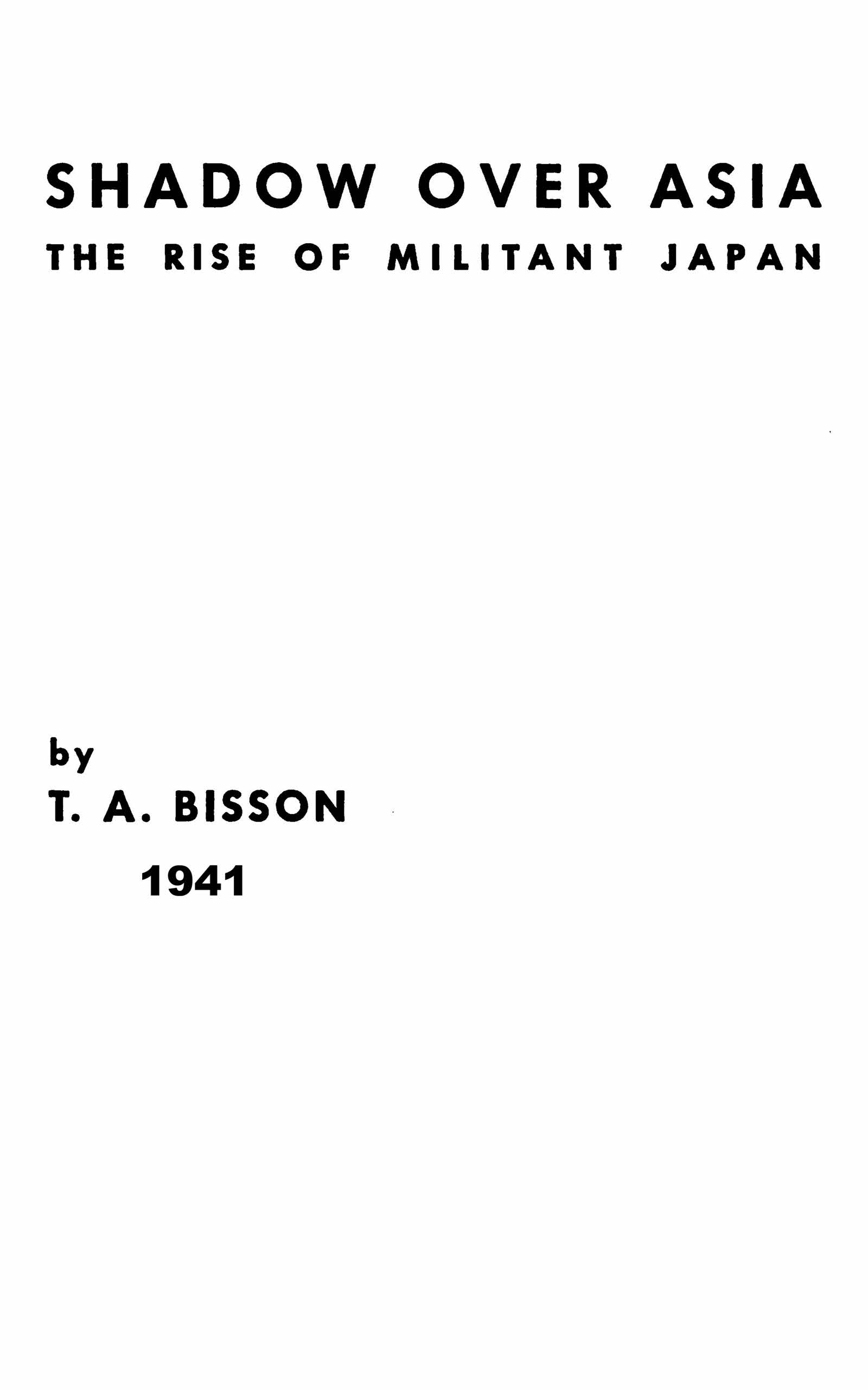 T. A. Bisson has been the Foreign Policy Association’s specialist on Far Eastern affairs since 1929. He has taught in China and travelled widely in the Far East. In addition to writing numerous Foreign Policy Reports, he is the author of Japan in China, published by the Macmillan Company in 1938, and American Policy in the Far East, 1931-1940, published by Institute of Pacific Relations in 1940.