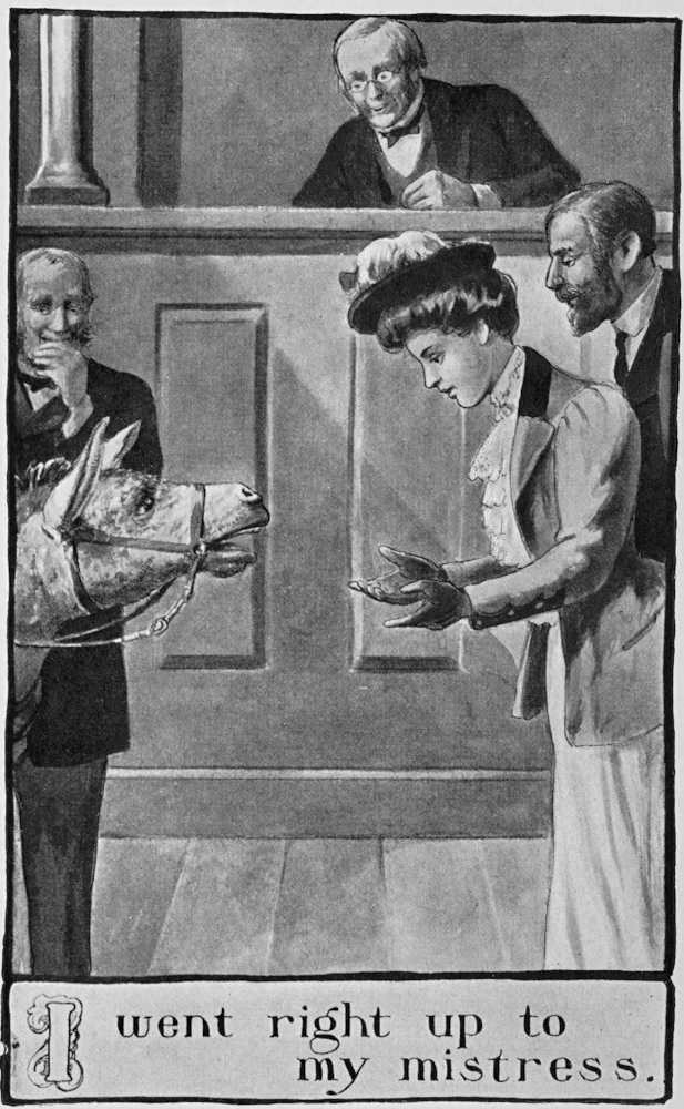 “You can remove the donkey out of court,” said the grave gentleman, and then he turned to my late master, who was standing dogged and silent, in charge of two of the police, and proceeded to address him in terms which I did not understand, my whole attention being now fixed upon myself, and upon the thought of being separated from my dear mistress, whom I had vainly hoped I was never to leave again. In my anxiety to remain by her side, I quite forgot that I was in a court of justice, and that, as a well-bred English donkey, it was my duty to submit myself to the laws of my land, and I struggled hard to pull away from the policeman’s hold, and to follow my mistress, who was now led back by her father to the seat from which she had risen.