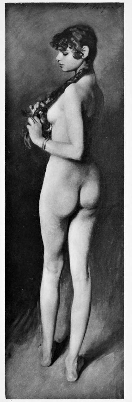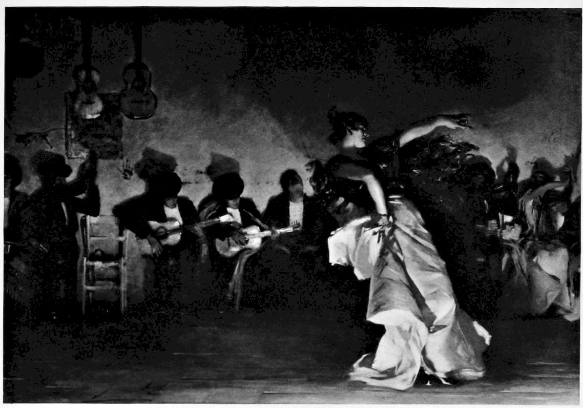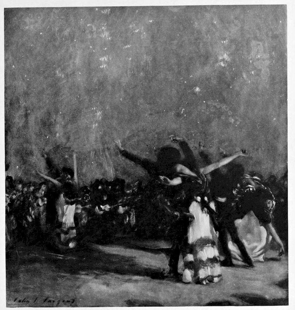 Those who would have refused to the art of painting—I think the idea began to be sent broadcast by the essay of a French critic dated some time after the middle of the nineteenth century or when the Romantique painters were, mostly, dead—those, I say, who debarred this art from dealing with any form of drama (for fear of “literature”) should consistently bar the attitude of action. The angel with the palm must not fly down to Tintoretto’s Ursula leading her multitude of martyrs. Titian’s tempestuous angel of the Annunciation must not run to the Virgin, with clapping wings and arm aloft under the cloud of an impatient sky; nor must his Dionysus spring to Ariadne from the car. Inasmuch as very few modern designers have the power of movement, this incapacitating rule would serve the turn of the time well enough, and no doubt has made shift to excuse the languor of those who had not energy. No need to discuss now the inconstancy of that rule which allows a wheel to turn, or a fountain to play; a wheel to turn, but not the living pinion of Gabriel, and a fountain to play, but not the muscle of Hercules. Mr. Sargent heeds no such inauthoritative law; and when he has not the vital stillness of a portrait, he has such a spirit of movement as that of “El Jaleo” and “A Spanish Dance,” the latter with its Goya-like, straight-topped throng in the background. He achieves not only the beauty of the attitude, but the power of the action, of the dance.