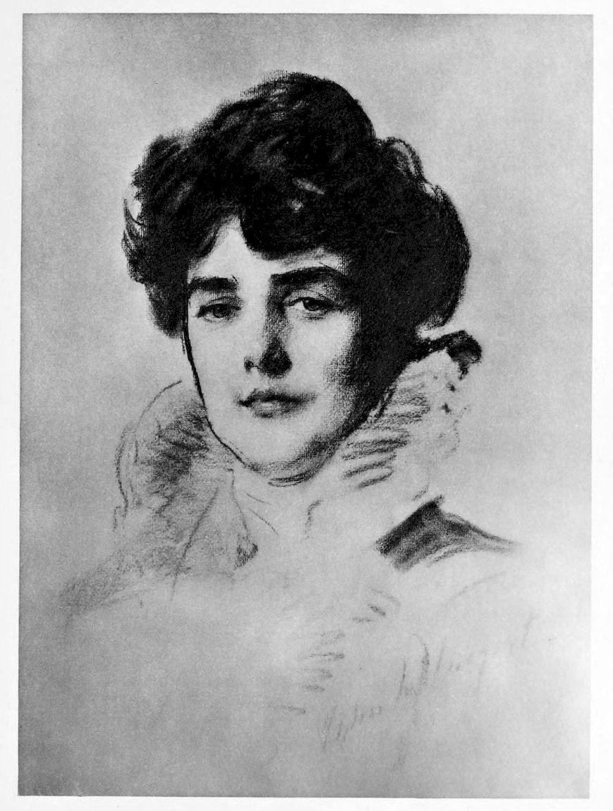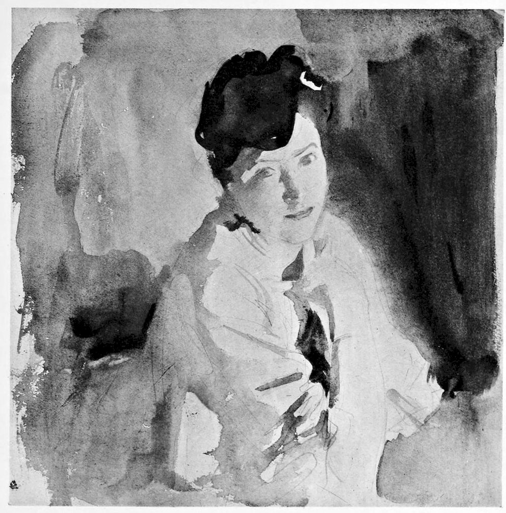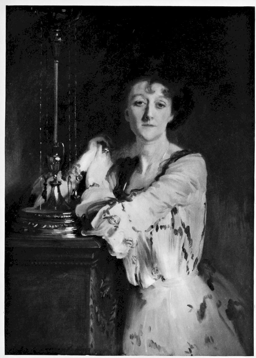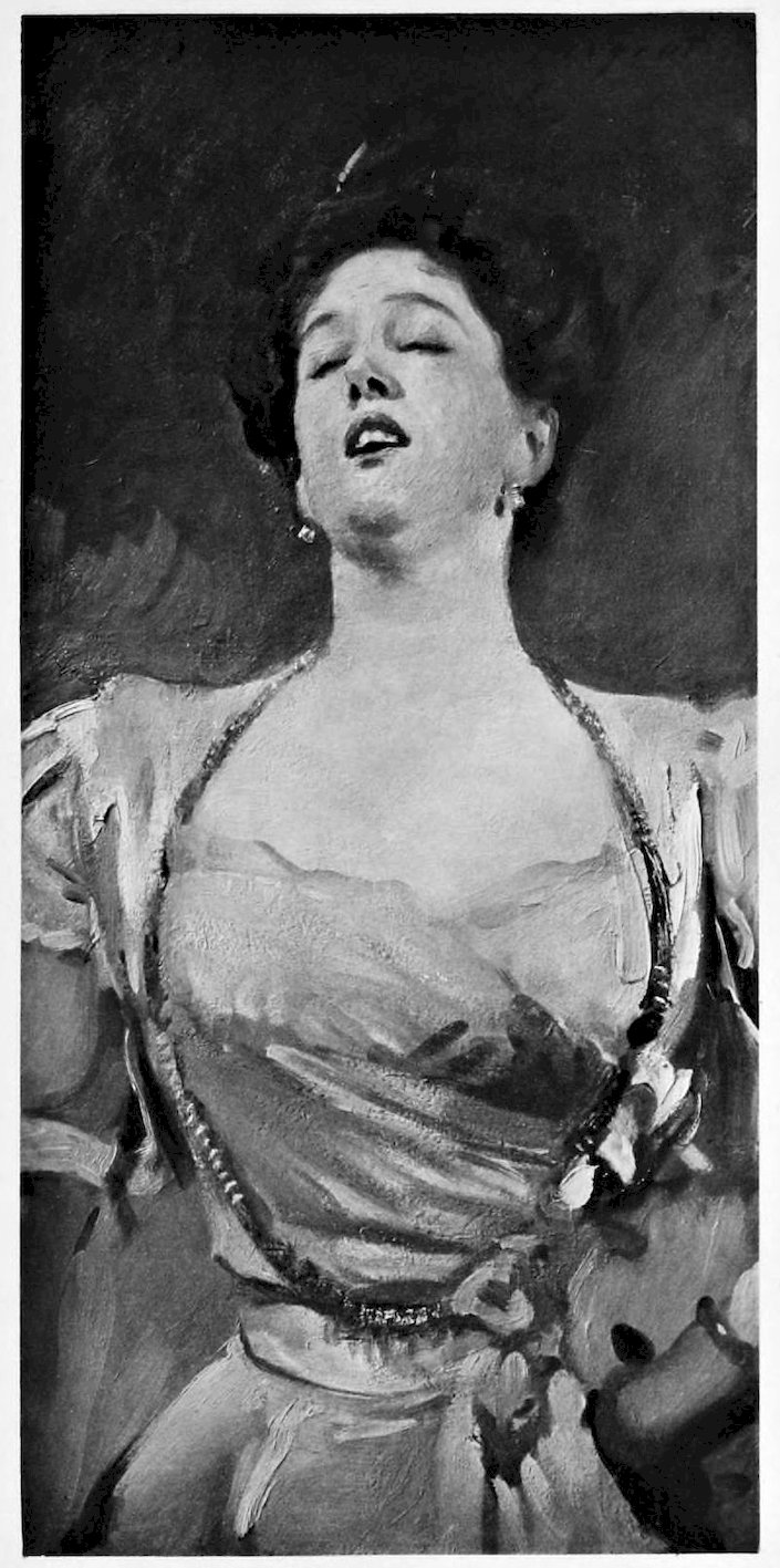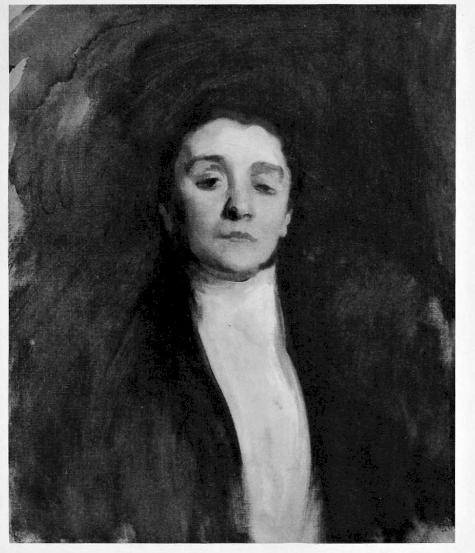 The race, nevertheless, does not overpower the least of the personal traits that are, personally, worthy of record. Mr. Sargent takes at times a sudden view, and thus makes permanent, too singly, one aspect of an often altering face. It seems to be so, for example, in the portrait of Coventry Patmore, in which that great poet’s vitality wears an aspect too plainly of mere warfare. Even here one may hesitate, conjecturing that some other eyes may see in this likeness traces of “the many movements” of a poet’s nature. But “one thing at a time” is the right rule for much portraiture; and yet again, it has perhaps been obeyed here where it should not. Elsewhere the accident of a moment that is not important may be something too passing for the dignity of a portrait; but assuredly this is noted only when there has been nothing to note that has a graver claim to “immortality.” I rather report another’s murmuring than my own (the murmuring of one who prizes Mr. Sargent’s genius in such a degree as no one can outdo) if I aver that he tells us, in a portrait, now and then, such a fact as that a man has or has not slept well. When he has something finer to show us, I do not think Mr. Sargent shows us that; but the graver conditions of life are so visible to him, and their aspect is so plain in the reflection of his picture, that it is told of one portrait that a physician made a diagnosis from it and named a malady until then uncertain—a disorder that has a characteristic effect upon bearing and expression. The ordinary eye might see in that expression nothing but a kind of demonstrative health. It is moreover interesting, in the case of this portrait, to know that the painter, at work on one of the finest pictures of his wonderful gallery, a picture magnificently arranged, was keen as well as large of sight, and saw both the pictorial beauty of the accessories and the difference between the look of another woman of the world and the look of this one, who wears her jewels with an almost secret difference. If the story is true, well; if it is not true, it has been aptly invented by one who must know something of Mr. Sargent’s manner of seeing and of perceiving what he sees. An example of the portrait of a moment that is full of spirit and action is that of Mrs. George Batten, which breathes the last note of a song—a note of Tosti’s, one might guess. With this we may compare the repose of the standing portrait of Lord Ribblesdale, in which one hardly knows whether face or figure is more expressive of the poise of life—the unstable equilibrium by which a man is thus admirably erect, so that nothing stable and secure seems so upright, and nothing in flight more full of life. Another pause is that in the face of Eleonora Duse in the quick sketch in oils of which the reproduction is one of the treasures of this book. The face is quite tranquil, so that other faces look uneasy in comparison, and the eyes under their sombre lids have, in this brief sketch, the most direct look in the world. The great tragedian gives in her portrait, as in her art, the impression of an incomparable sincerity, and faces us from the yonder side of the common human custom of intercepted, veiled, retreating or hesitating looks. She does not find these minor disguises to be worth while. Mr. Sargent’s sketch is peculiarly moderate, and the reproduction happily keeps all the distinction he has made between the one large light on the forehead and the lower lights on the nose, cheek, and chin, so that it is the modelling of the forehead that is most important, but one part is as simple as another.