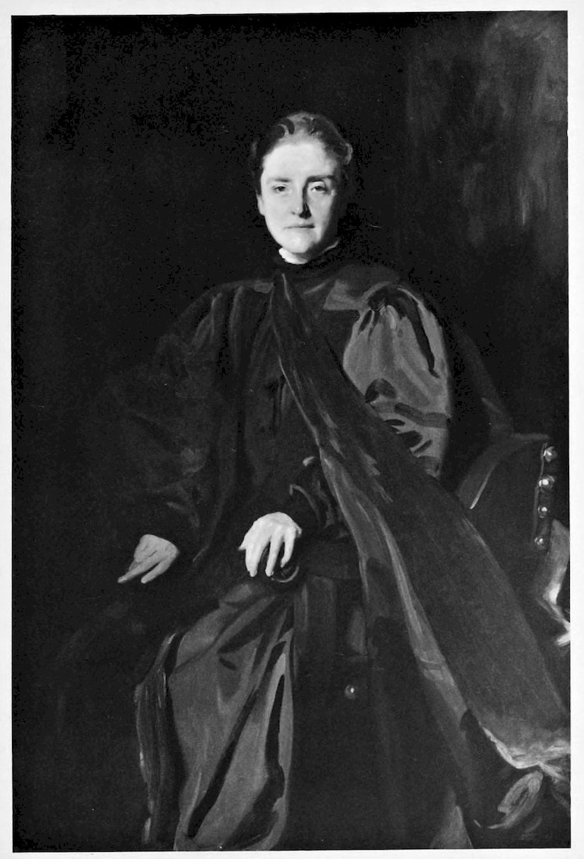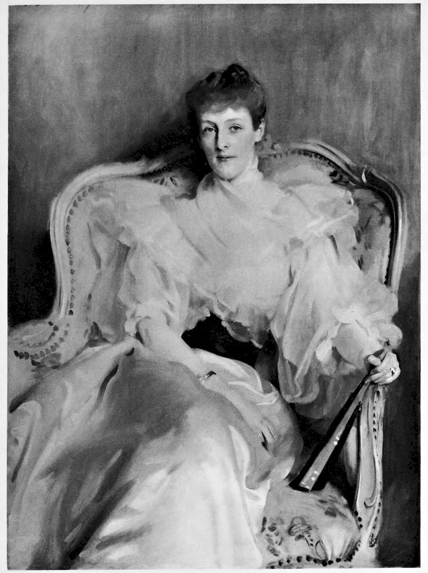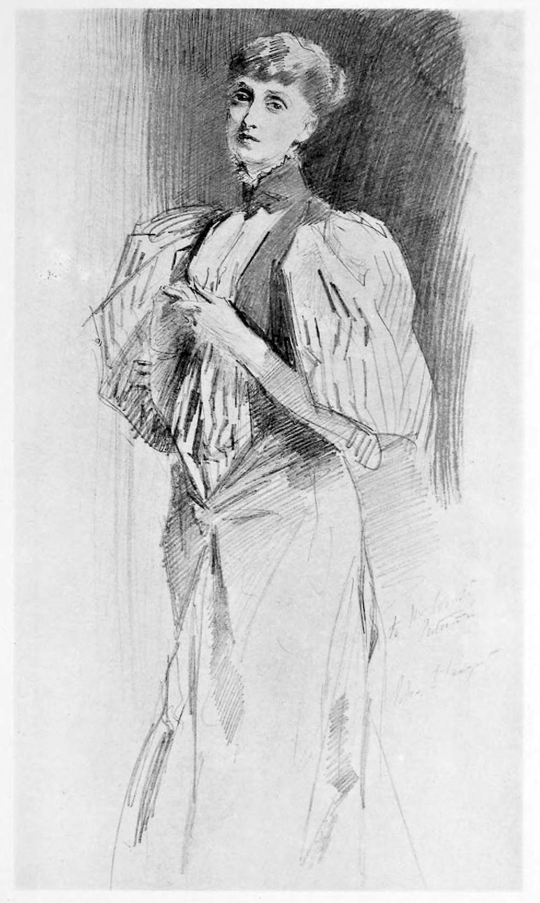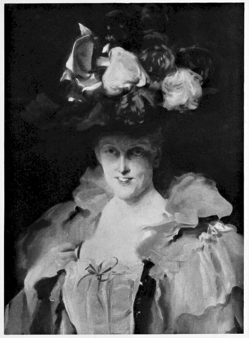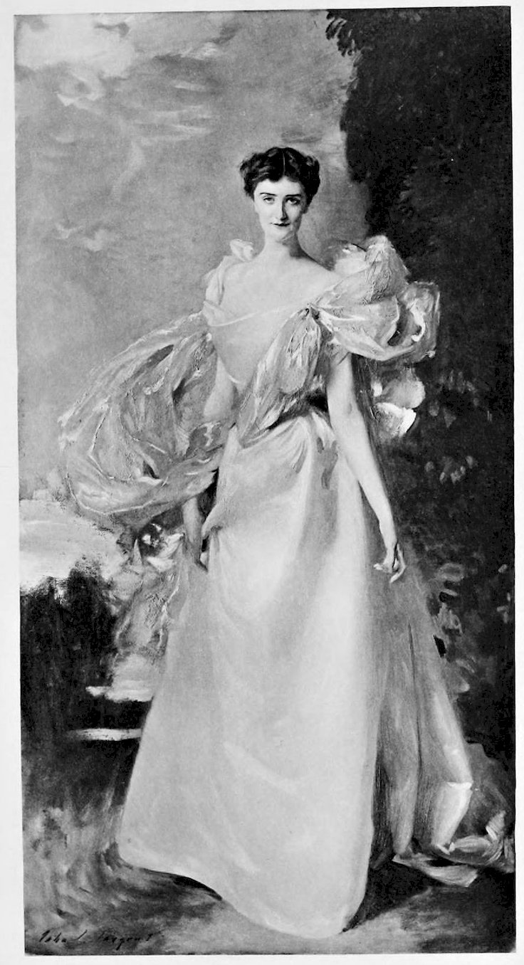 The race, nevertheless, does not overpower the least of the personal traits that are, personally, worthy of record. Mr. Sargent takes at times a sudden view, and thus makes permanent, too singly, one aspect of an often altering face. It seems to be so, for example, in the portrait of Coventry Patmore, in which that great poet’s vitality wears an aspect too plainly of mere warfare. Even here one may hesitate, conjecturing that some other eyes may see in this likeness traces of “the many movements” of a poet’s nature. But “one thing at a time” is the right rule for much portraiture; and yet again, it has perhaps been obeyed here where it should not. Elsewhere the accident of a moment that is not important may be something too passing for the dignity of a portrait; but assuredly this is noted only when there has been nothing to note that has a graver claim to “immortality.” I rather report another’s murmuring than my own (the murmuring of one who prizes Mr. Sargent’s genius in such a degree as no one can outdo) if I aver that he tells us, in a portrait, now and then, such a fact as that a man has or has not slept well. When he has something finer to show us, I do not think Mr. Sargent shows us that; but the graver conditions of life are so visible to him, and their aspect is so plain in the reflection of his picture, that it is told of one portrait that a physician made a diagnosis from it and named a malady until then uncertain—a disorder that has a characteristic effect upon bearing and expression. The ordinary eye might see in that expression nothing but a kind of demonstrative health. It is moreover interesting, in the case of this portrait, to know that the painter, at work on one of the finest pictures of his wonderful gallery, a picture magnificently arranged, was keen as well as large of sight, and saw both the pictorial beauty of the accessories and the difference between the look of another woman of the world and the look of this one, who wears her jewels with an almost secret difference. If the story is true, well; if it is not true, it has been aptly invented by one who must know something of Mr. Sargent’s manner of seeing and of perceiving what he sees. An example of the portrait of a moment that is full of spirit and action is that of Mrs. George Batten, which breathes the last note of a song—a note of Tosti’s, one might guess. With this we may compare the repose of the standing portrait of Lord Ribblesdale, in which one hardly knows whether face or figure is more expressive of the poise of life—the unstable equilibrium by which a man is thus admirably erect, so that nothing stable and secure seems so upright, and nothing in flight more full of life. Another pause is that in the face of Eleonora Duse in the quick sketch in oils of which the reproduction is one of the treasures of this book. The face is quite tranquil, so that other faces look uneasy in comparison, and the eyes under their sombre lids have, in this brief sketch, the most direct look in the world. The great tragedian gives in her portrait, as in her art, the impression of an incomparable sincerity, and faces us from the yonder side of the common human custom of intercepted, veiled, retreating or hesitating looks. She does not find these minor disguises to be worth while. Mr. Sargent’s sketch is peculiarly moderate, and the reproduction happily keeps all the distinction he has made between the one large light on the forehead and the lower lights on the nose, cheek, and chin, so that it is the modelling of the forehead that is most important, but one part is as simple as another.
