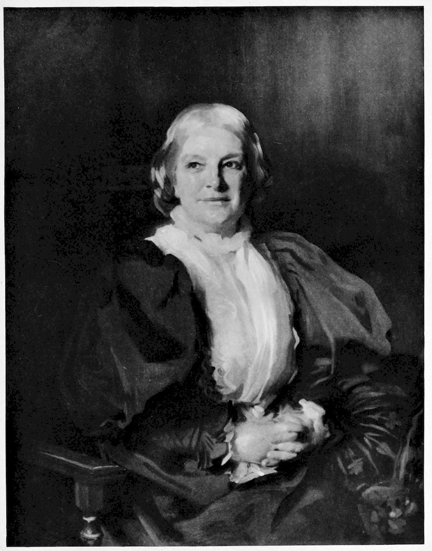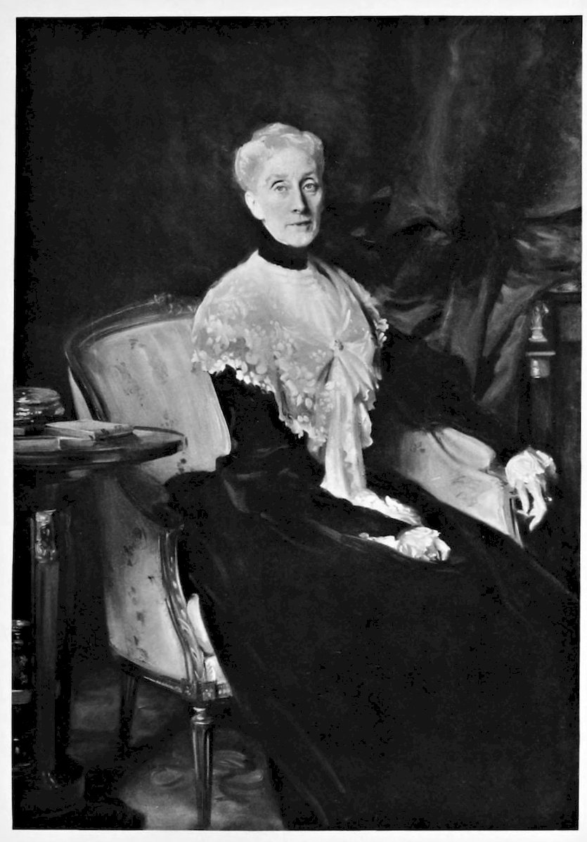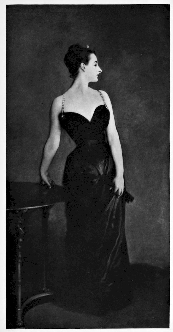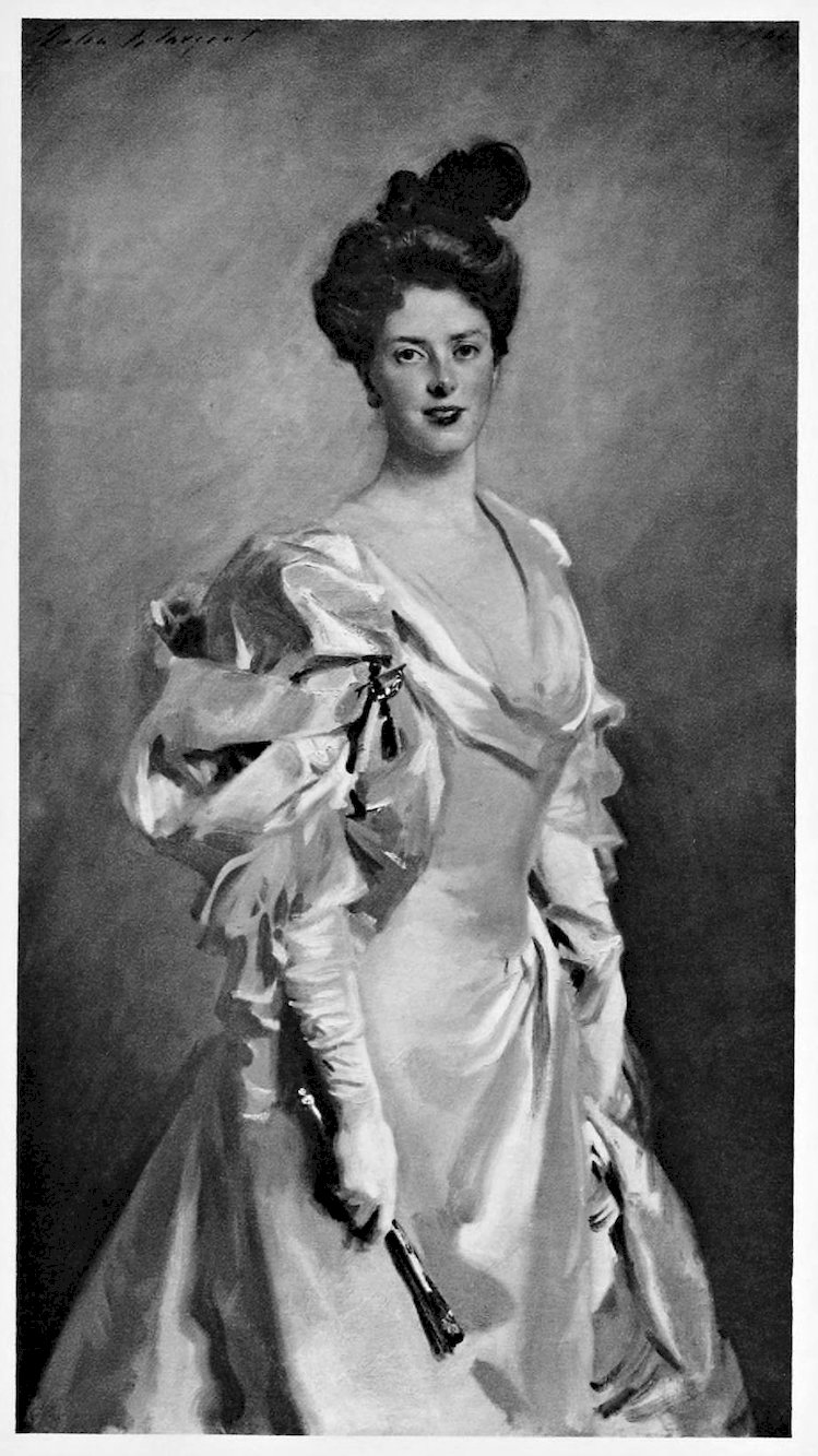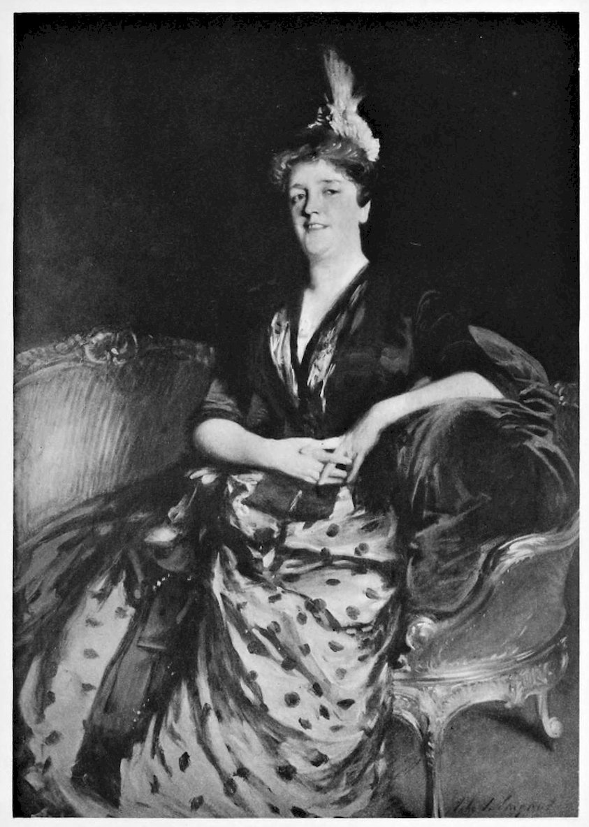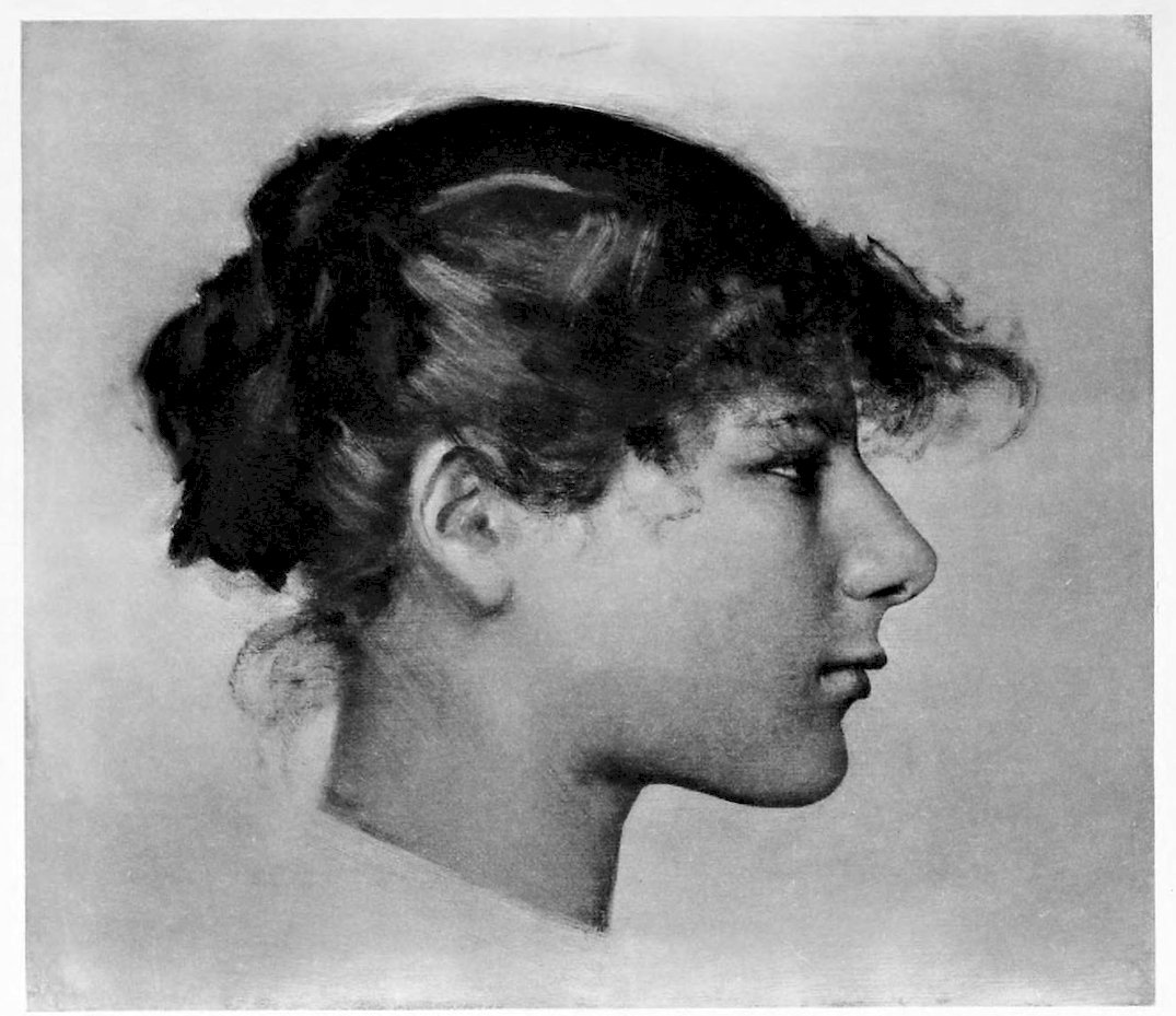 The race, nevertheless, does not overpower the least of the personal traits that are, personally, worthy of record. Mr. Sargent takes at times a sudden view, and thus makes permanent, too singly, one aspect of an often altering face. It seems to be so, for example, in the portrait of Coventry Patmore, in which that great poet’s vitality wears an aspect too plainly of mere warfare. Even here one may hesitate, conjecturing that some other eyes may see in this likeness traces of “the many movements” of a poet’s nature. But “one thing at a time” is the right rule for much portraiture; and yet again, it has perhaps been obeyed here where it should not. Elsewhere the accident of a moment that is not important may be something too passing for the dignity of a portrait; but assuredly this is noted only when there has been nothing to note that has a graver claim to “immortality.” I rather report another’s murmuring than my own (the murmuring of one who prizes Mr. Sargent’s genius in such a degree as no one can outdo) if I aver that he tells us, in a portrait, now and then, such a fact as that a man has or has not slept well. When he has something finer to show us, I do not think Mr. Sargent shows us that; but the graver conditions of life are so visible to him, and their aspect is so plain in the reflection of his picture, that it is told of one portrait that a physician made a diagnosis from it and named a malady until then uncertain—a disorder that has a characteristic effect upon bearing and expression. The ordinary eye might see in that expression nothing but a kind of demonstrative health. It is moreover interesting, in the case of this portrait, to know that the painter, at work on one of the finest pictures of his wonderful gallery, a picture magnificently arranged, was keen as well as large of sight, and saw both the pictorial beauty of the accessories and the difference between the look of another woman of the world and the look of this one, who wears her jewels with an almost secret difference. If the story is true, well; if it is not true, it has been aptly invented by one who must know something of Mr. Sargent’s manner of seeing and of perceiving what he sees. An example of the portrait of a moment that is full of spirit and action is that of Mrs. George Batten, which breathes the last note of a song—a note of Tosti’s, one might guess. With this we may compare the repose of the standing portrait of Lord Ribblesdale, in which one hardly knows whether face or figure is more expressive of the poise of life—the unstable equilibrium by which a man is thus admirably erect, so that nothing stable and secure seems so upright, and nothing in flight more full of life. Another pause is that in the face of Eleonora Duse in the quick sketch in oils of which the reproduction is one of the treasures of this book. The face is quite tranquil, so that other faces look uneasy in comparison, and the eyes under their sombre lids have, in this brief sketch, the most direct look in the world. The great tragedian gives in her portrait, as in her art, the impression of an incomparable sincerity, and faces us from the yonder side of the common human custom of intercepted, veiled, retreating or hesitating looks. She does not find these minor disguises to be worth while. Mr. Sargent’s sketch is peculiarly moderate, and the reproduction happily keeps all the distinction he has made between the one large light on the forehead and the lower lights on the nose, cheek, and chin, so that it is the modelling of the forehead that is most important, but one part is as simple as another.
