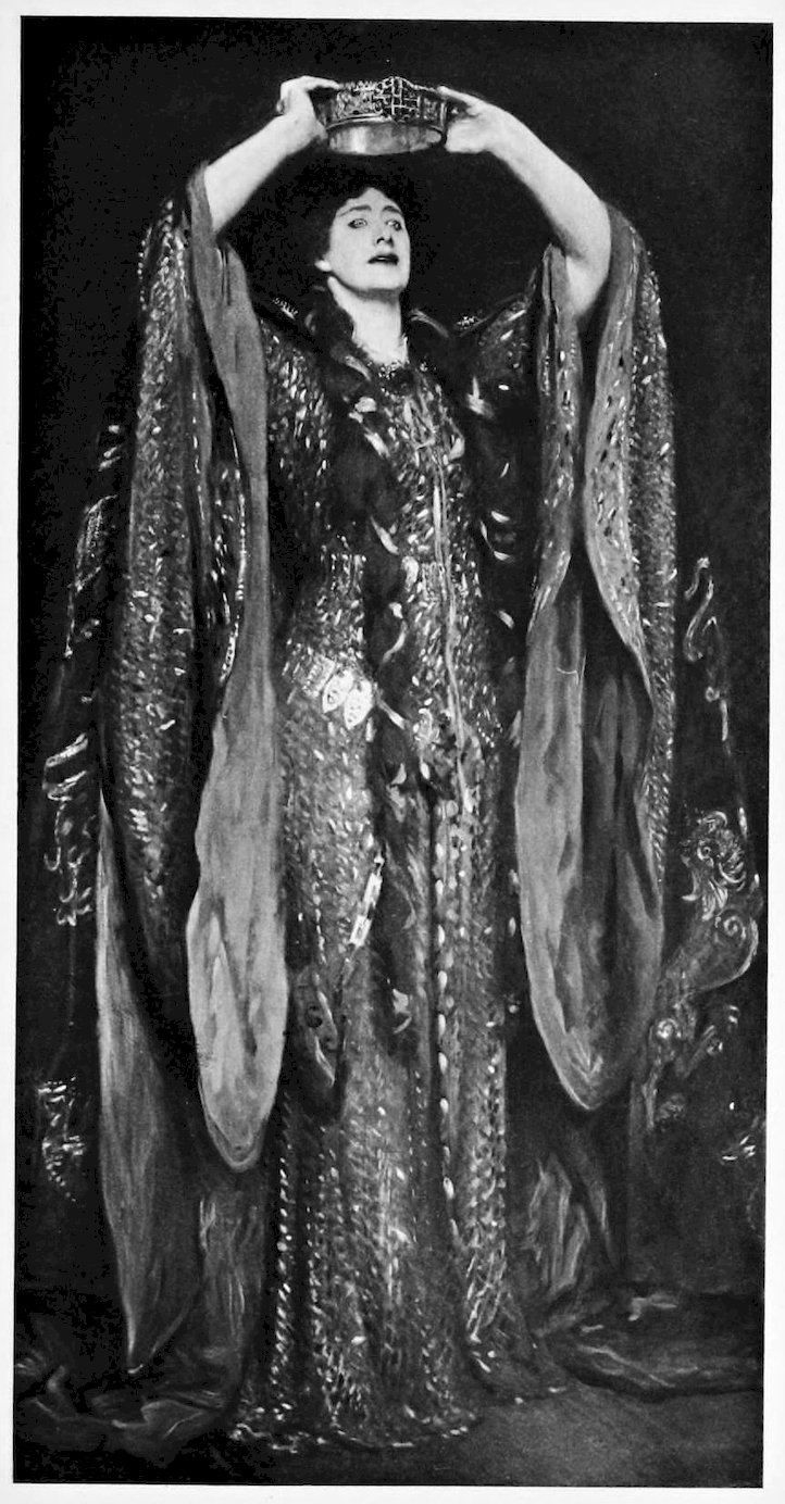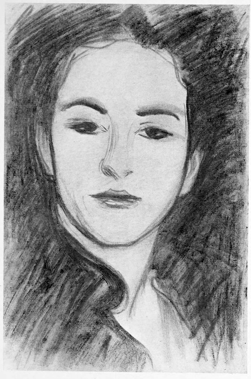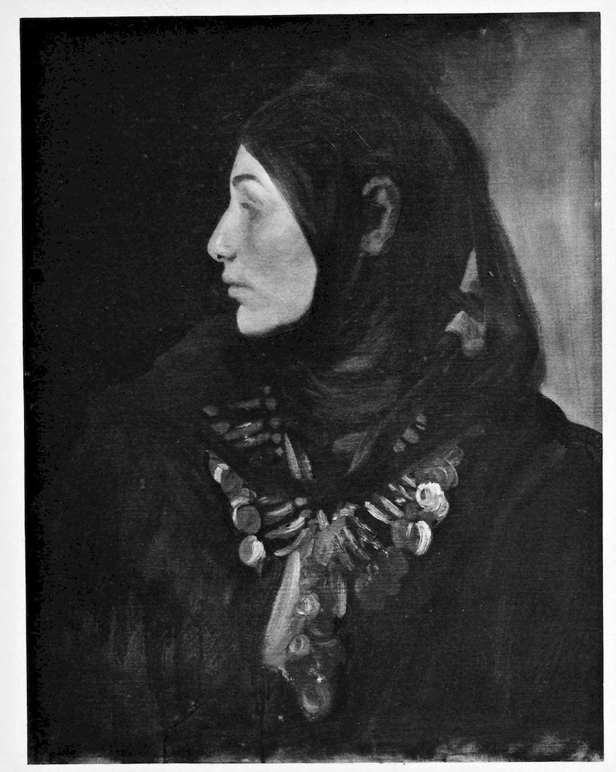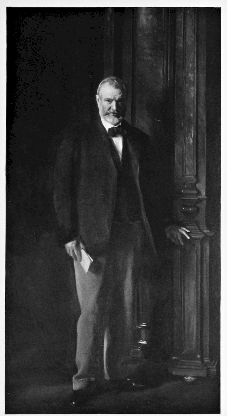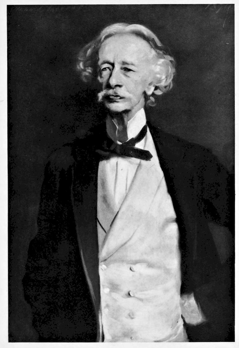 The race, nevertheless, does not overpower the least of the personal traits that are, personally, worthy of record. Mr. Sargent takes at times a sudden view, and thus makes permanent, too singly, one aspect of an often altering face. It seems to be so, for example, in the portrait of Coventry Patmore, in which that great poet’s vitality wears an aspect too plainly of mere warfare. Even here one may hesitate, conjecturing that some other eyes may see in this likeness traces of “the many movements” of a poet’s nature. But “one thing at a time” is the right rule for much portraiture; and yet again, it has perhaps been obeyed here where it should not. Elsewhere the accident of a moment that is not important may be something too passing for the dignity of a portrait; but assuredly this is noted only when there has been nothing to note that has a graver claim to “immortality.” I rather report another’s murmuring than my own (the murmuring of one who prizes Mr. Sargent’s genius in such a degree as no one can outdo) if I aver that he tells us, in a portrait, now and then, such a fact as that a man has or has not slept well. When he has something finer to show us, I do not think Mr. Sargent shows us that; but the graver conditions of life are so visible to him, and their aspect is so plain in the reflection of his picture, that it is told of one portrait that a physician made a diagnosis from it and named a malady until then uncertain—a disorder that has a characteristic effect upon bearing and expression. The ordinary eye might see in that expression nothing but a kind of demonstrative health. It is moreover interesting, in the case of this portrait, to know that the painter, at work on one of the finest pictures of his wonderful gallery, a picture magnificently arranged, was keen as well as large of sight, and saw both the pictorial beauty of the accessories and the difference between the look of another woman of the world and the look of this one, who wears her jewels with an almost secret difference. If the story is true, well; if it is not true, it has been aptly invented by one who must know something of Mr. Sargent’s manner of seeing and of perceiving what he sees. An example of the portrait of a moment that is full of spirit and action is that of Mrs. George Batten, which breathes the last note of a song—a note of Tosti’s, one might guess. With this we may compare the repose of the standing portrait of Lord Ribblesdale, in which one hardly knows whether face or figure is more expressive of the poise of life—the unstable equilibrium by which a man is thus admirably erect, so that nothing stable and secure seems so upright, and nothing in flight more full of life. Another pause is that in the face of Eleonora Duse in the quick sketch in oils of which the reproduction is one of the treasures of this book. The face is quite tranquil, so that other faces look uneasy in comparison, and the eyes under their sombre lids have, in this brief sketch, the most direct look in the world. The great tragedian gives in her portrait, as in her art, the impression of an incomparable sincerity, and faces us from the yonder side of the common human custom of intercepted, veiled, retreating or hesitating looks. She does not find these minor disguises to be worth while. Mr. Sargent’s sketch is peculiarly moderate, and the reproduction happily keeps all the distinction he has made between the one large light on the forehead and the lower lights on the nose, cheek, and chin, so that it is the modelling of the forehead that is most important, but one part is as simple as another.