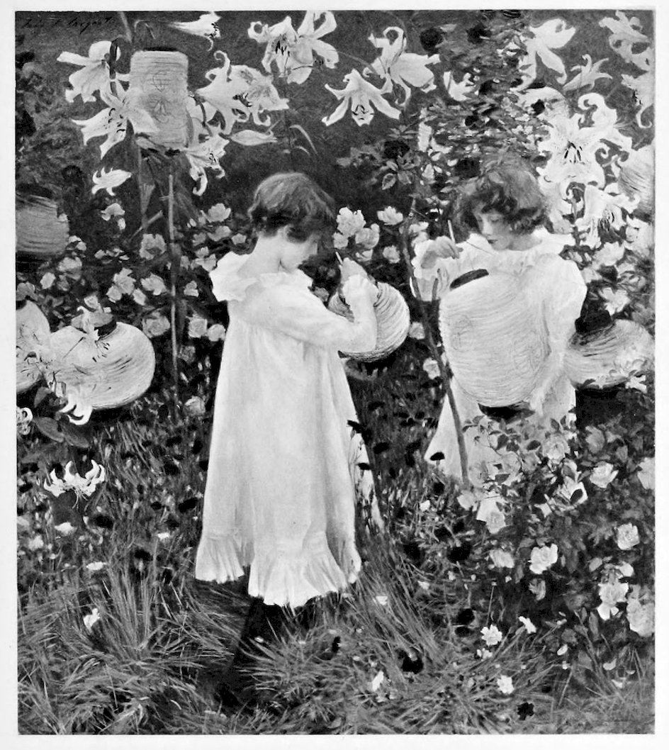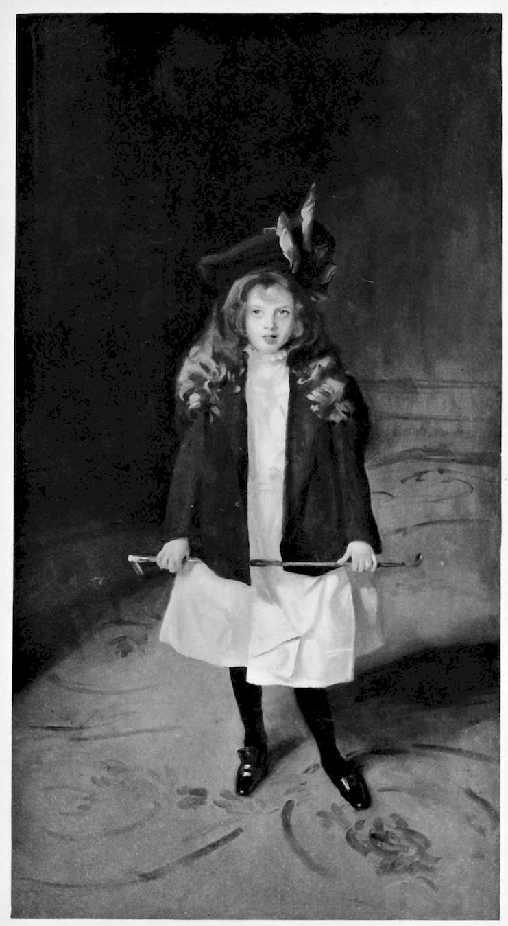 Amongst the pictures of children, the portrait of The Hon. Laura Lister takes its place with the most beautiful painted in all centuries since it was first held worth while to paint that childhood which the fathers and mothers of old were in haste to see securely past. Portraiture came comparatively late in the Italian schools—Venice apart—and seems to console or flatter their decline; and the portraits of children came last. But in Spain, Holland, Venice, and England, the great age was an age of portraits, and in our time the best work, since the landscapes of Norwich and Barbizon came to an end, is portraiture again. Portraits of childhood and an exquisite study of twilight and lantern-light, with the fine violet tints that artificial light lends to evening air, and with white as lovely in its coolness as the white of Titian in its gold, are united in the Garden picture, “Carnation, Lily, Lily, Rose”. It is strange that any one affects to make light of truth and to look elsewhere for decoration, when nature and truth can look so beautiful.