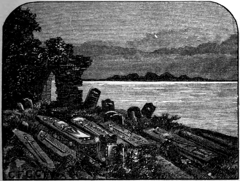 Of the old kirkyards in Cantyre, perhaps the most striking is one at the extreme end of the Moyle, near the ruined Fort of Dunaverty before alluded to; just such a one as that where King Arthur was laid, when sorely wounded in that battle among the mountains beside the winter sea—