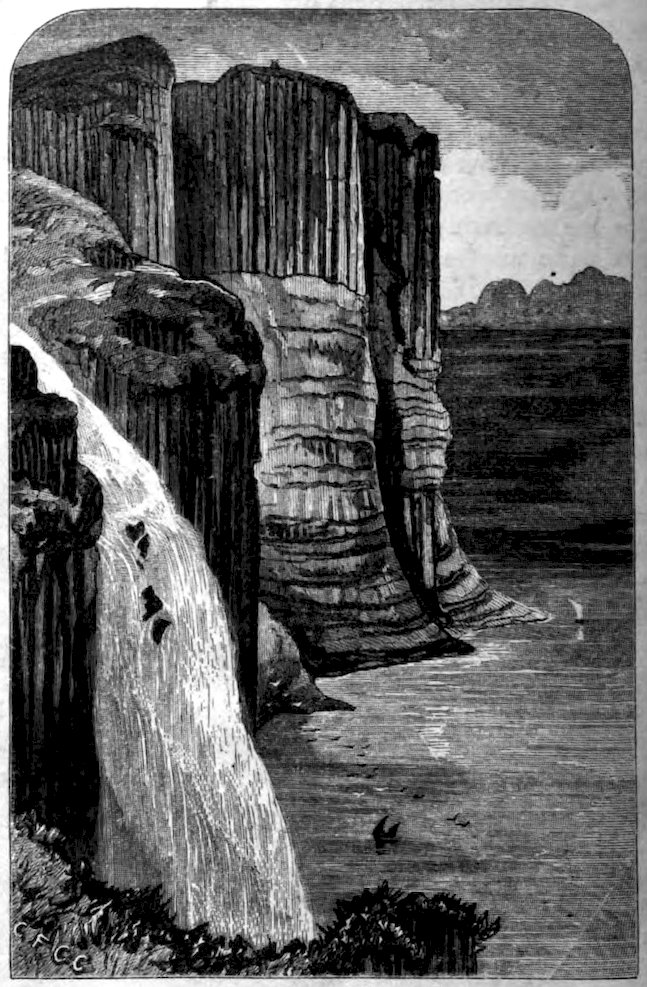 First of all comes the crowning mass of huge columnar basalt, red, brown, and yellow. Below this lies—