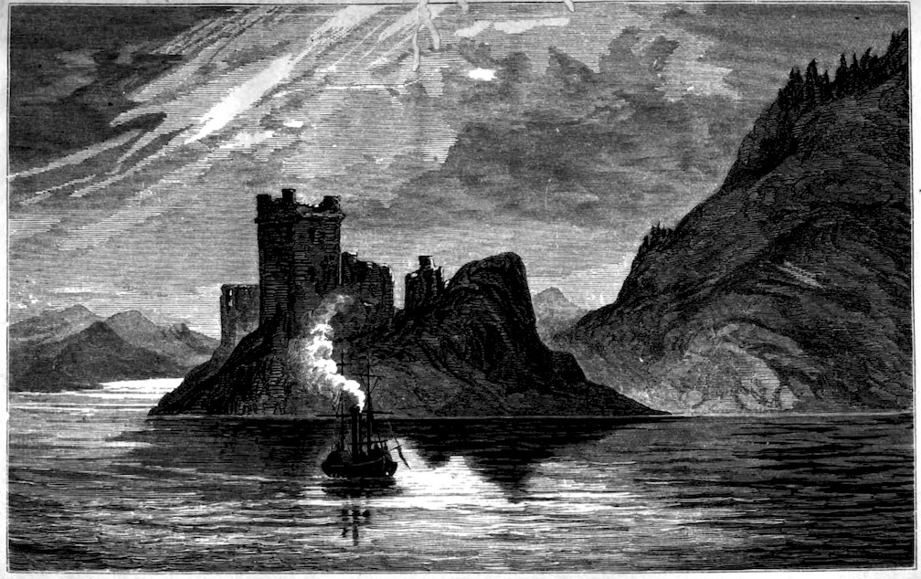 376Then away we sailed in the little steamer, taking a farewell look at Castle Urquhart, said to have been once an old holding of the Clan Cumming, and in later days one of the old royal forts of Scotland, besieged by Edward I. in 1303, and which stood many a hard tussle with the English in the succeeding years. For the last three hundred years there has been no mention of it in any chronicle of fight or fray. It is now a picturesque ruin, rising from the loch on a rocky promontory. The Highlanders call these grey ruins Strone Castle, and believe that two mysterious vaulted cells are hollowed in the rock below. The one contains a countless treasure of gold; but in the other a fearful pestilence is sealed up, which, if once released, would stalk forth in irresistible might and depopulate the land, having first slain the rash hand that opened its prison door. So the dread of liberating so dire a scourge has even subdued the covetous craving for gold, and the treasure-chamber remains inviolate.