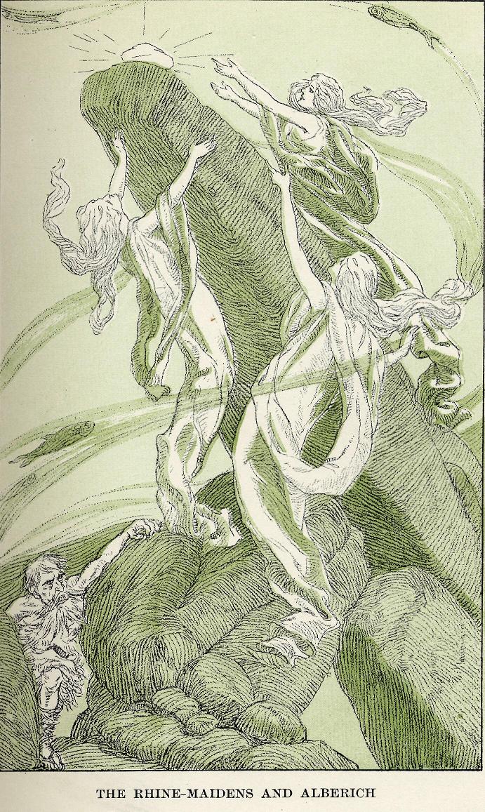 "Oh! Sisters! See how Alberich is staring at our gold!" whispered one of the Rhine-daughters. "Perhaps this is the foe of which our father warned us. How careless we have been!"