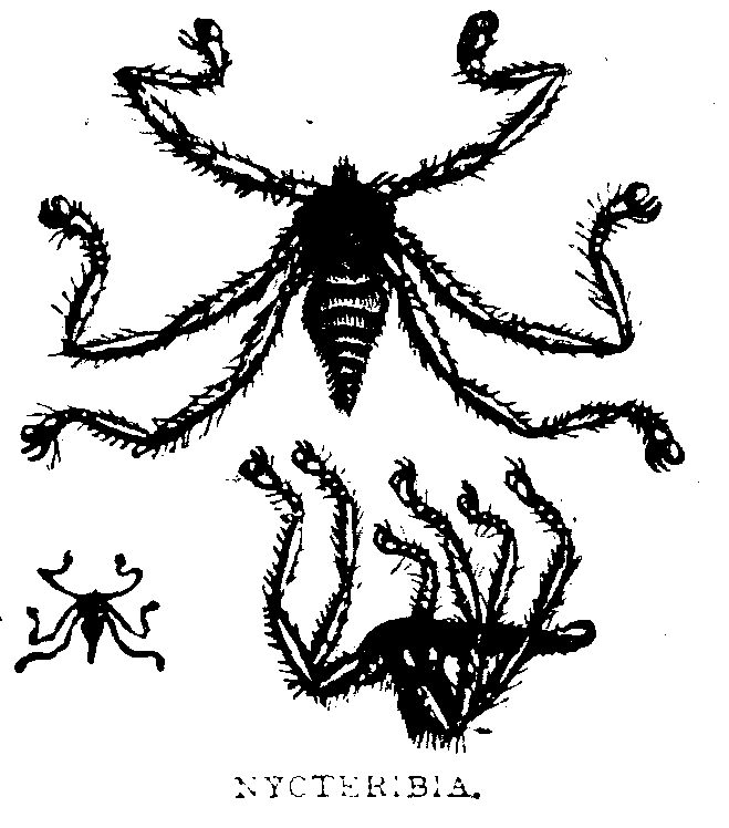 Although not strictly in order, this seems not an inappropriate place to notice one of the most curious peculiarities connected with the bats—their singular parasite, the Nycteribia.202 On cursory observation this creature appears to have neither head, antennæ, eyes, nor mouth; and the earlier observers of its structure satisfied themselves that the place of the latter was supplied by a cylindrical sucker, which, being placed between the shoulders, the insect had no option but to turn on its back to feed. Another anomaly was thought to compensate for this apparent inconvenience;—its three pairs of legs, armed with claws, are so arranged that they seem to be equally distributed over its upper and under sides, the creature being thus enabled to use them like hands, and to grasp the strong hairs above it while extracting its nourishment.