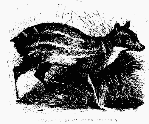 Of the lesser feline species, the number and variety in Ceylon is inferior to those of India. The Palm-cat322 lurks by day among the fronds of the coco-nut palms, and by night makes destructive forays on the fowls of the villagers; and, in order to suck the blood of its victim, inflicts a wound so small as to be almost imperceptible. The glossy genette323, the "Civet" of Europeans, is common in the northern province, where the Tamils confine it in cages for the sake of its musk, which they collect from the wooden bars on which it rubs itself. Edrisi, the Moorish geographer, writing in the twelfth century, enumerates musk as one of the productions then exported from Ceylon.324