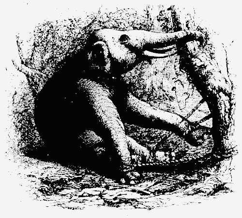 Its strangest peculiarity, and that which gave rise to the belief that it was headless, is its faculty when at rest of throwing back its head and pressing it close between its shoulders till the under side becomes uppermost, not a vestige of head being discernible where we would naturally look for it, and the whole seeming but a casual inequality on its back.