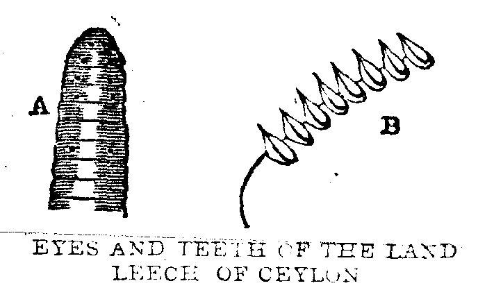 Footnote 4841: (return)Hæmopsis paludum. In size the cattle leech of Ceylon is somewhat larger than the medicinal leech of Europe: in colour it is of a uniform brown without bands, unless a rufous margin may be so considered. It has dark striæ. The body is somewhat rounded, flat when swimming, and composed of rather more than ninety rings. The greatest dimension is a little in advance of the anal sucker; the body thence tapers to the other extremity, which ends in an upper lip projecting considerably beyond the mouth. The eyes, ten in number, are disposed as in the common leech. The mouth is oval, the biting apparatus with difficulty seen, and the teeth not very numerous. The bite is so little acute that the moment of attachment, and the incision of the membrane is scarcely perceived by the sufferer from its attack.