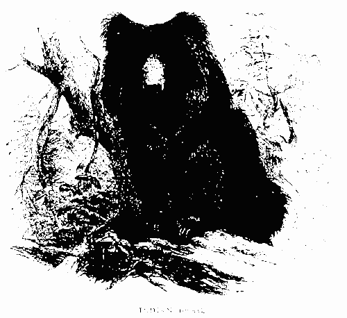 2. The low country Wanderoo is replaced in the hills by the larger species, P. ursinus, which inhabits the mountain zone. The natives, who designate the latter the Maha or Great Wanderoo, to distinguish it from the Kaloo, or black one, with which they are familiar, describe it as much wilder, and more powerful than its congener of the lowland forests. It is rarely seen by Europeans, this portion of the country having till very recently been but partially opened; and even now it is difficult to observe its habits, as it seldom approaches the few roads which wind through these deep solitudes. At early morning, ere the day begins to dawn, its loud and peculiar howl, which consists of a quick repetition [pg 10] of the sounds how how! maybe frequently heard in the mountain jungles, and forms one of the characteristic noises of these lofty situations. It was first captured by Dr. Kelaart in the woods near Nuera-ellia, and from its peculiar appearance it has been named P. ursinus by Mr. Blyth.101