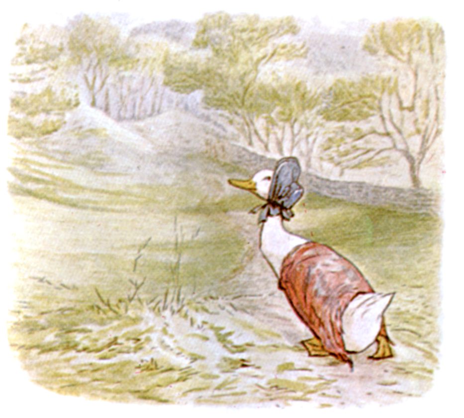 Jemima Puddle-duck became quite desperate. She determined to make a nest right away from the farm.