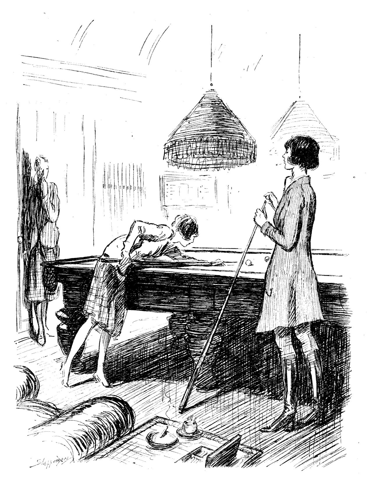 In this the eighth instalment of my series on Auction etiquette, I should like to urge once more upon the young Bridge-player the importance of playing quickly. And this because yet another case has come under my notice in which much trouble might have been avoided by doing so. In this case A. took seven minutes to decide whether to play the King or the Knave, which, especially as the Queen had already been played, was, I consider, far too long. Y., the declarer, sitting on A.'s left, certainly found it so, for towards the end of the seventh minute he dropped off to sleep and his cards fell forward face upward on the table. Dummy having gone away in search of liquid refreshment, A. and his partner B. then played out the hand as they liked and then roused Y. to inform him that, instead of making game, he had lost three hundred above.