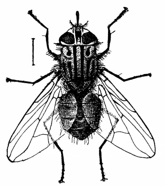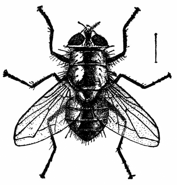 Several species of metallic greenish or bluish flies also are found occasionally in houses. These include a blue-bottle fly,[4] the black blowflies,[5] and the green-bottle (fig. 2) flies.[6] They breed in decaying animal matter.