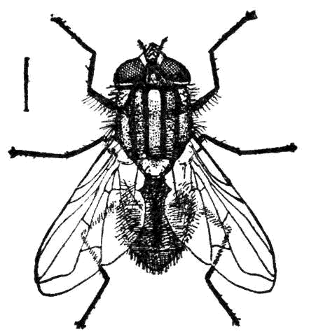 The true house fly (fig. 3), which is found in nearly all parts of the world, is a medium-sized fly with four black stripes on the back and a sharp elbow in one of the veins of the wings. The house fly can not bite, its mouth parts being spread out at the tip for sucking up liquid substances.