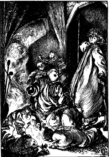 He opened the door and peered forth into the night. There, just before him, stood seven little men huddled up together; three feet high they were, with bright yellow faces all shrivelled and sharp, and eyes [pg 6] whose light leaped and sank like candle flame before a gust.