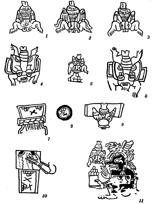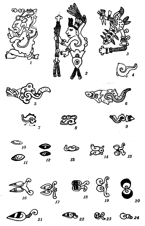 We have not limited ourselves entirely to the Maya manuscripts as we have drawn upon the vast amount of material available in the stone carvings, the stucco figures, and the frescoes found throughout the Maya area. This material has by no means been exhausted in the present paper. In addition to the figures from the Maya codices and a comparatively few from other sources in the Maya region, we have introduced for comparison in a number of cases figures from a few of the ancient manuscripts of the Nahuas and the Zapotecs to the north. The calendar of these two peoples is fundamentally the same as that of the Mayas. The year is made up in the same way being composed of eighteen months of twenty days each with five days additional at the end of the year. There is therefore a more or less close connection as regards subject matter in all the pre-Columbian codices of Mexico and Central America but the manner of presentation differs among the different peoples of this region.