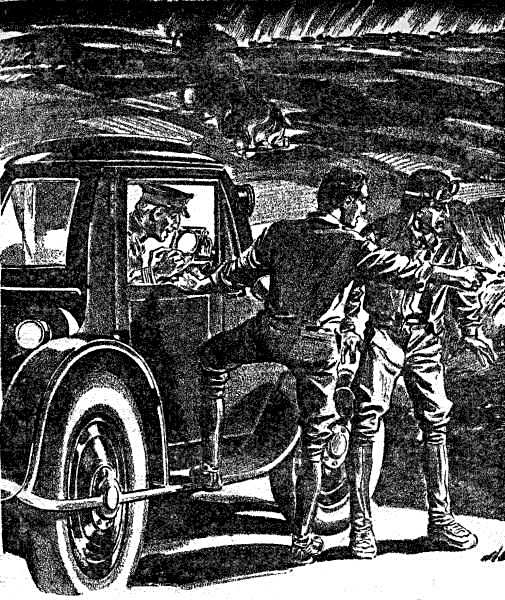 "I hid," said Sergeant Walpole, woodenly. "The Wabbly sent over gas-shells where the ships landed. Then it went on. Headin' west. It's got a crazy-lookin' dinkus on top like a searchlight. That moved, while the ships were catchin' fire an' crashin'. Just like a searchlight, it moved an' the ships went down. But the Wabbly didn't fire a shot."