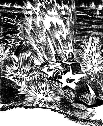 He fumbled with the rifle, suddenly swearing queerly hate-distorted oaths. Tillie had not been the great love of Sergeant Walpole's life. She was merely a country telephone operator, reasonably pretty, and flattered by his uniform. But she was under a mass of splintered wood and crushed brick-work, killed while trying to connect with the tight beam to Area Headquarters to report the monster rushing upon the village. That monster had destroyed the little settlement. There was nothing left at all but wreckage and the eight-foot tracks of monster treads. Sometimes those tracks crossed each other. Between them wreckage survived to a height of as much as four feet, which was the clearance of the Wabbly's body.