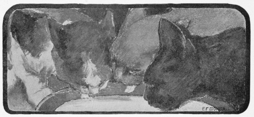 As she edged slowly toward them the three waifs paid no attention to her, beyond giving a warning growl or two, which Snowball—not understanding that she could be unwelcome—mistook for their usual way of speaking. With a friendly "P-r-r-r-rh!" of greeting she drew near, and lapped daintily at the strongly flavoured milk. Was it hunger, or the feeling of liberty and comradeship that made it taste so good and made her for one short instant perfectly happy?