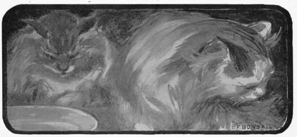 Pan stalked into the library and choosing, cat-like, the one spot he should have kept away from, curled up on a handsome book that was lying open on the table and forgot his troubles in sleep. For some time Topsy wandered aimlessly from room to room; then preferring Pan's society to no society at all—she did not feel kindly towards human beings since her late whipping—she leaped lightly on to the table and curled up near him. For fully half an hour she sat idly with half-closed eyes, while Pan slept on, a perfect picture of innocent slumber. Then his paws began to jerk excitedly; his mouth twitched, and the tip of his tail waved like a pennant in a stiff breeze. Topsy eyed him coldly.