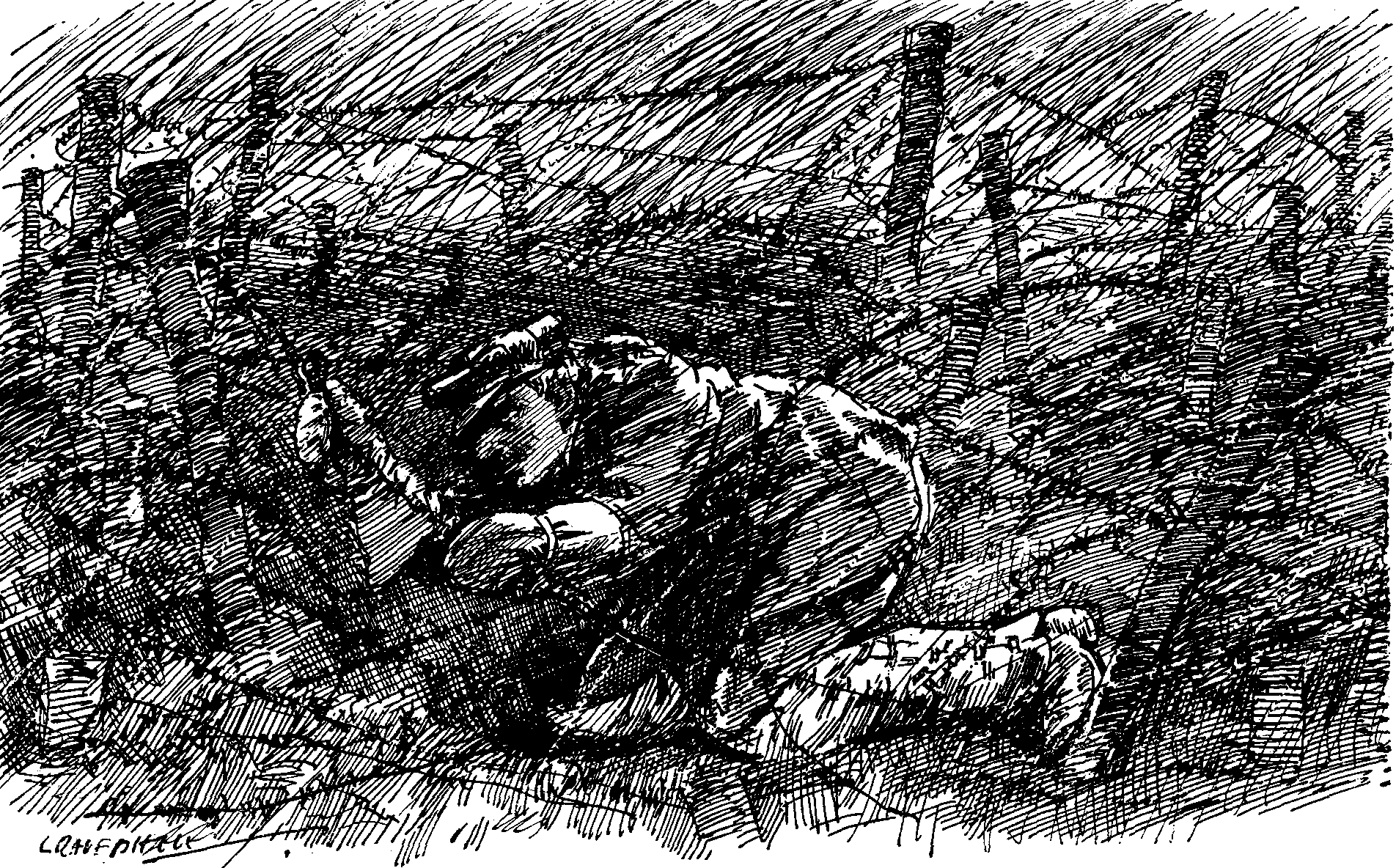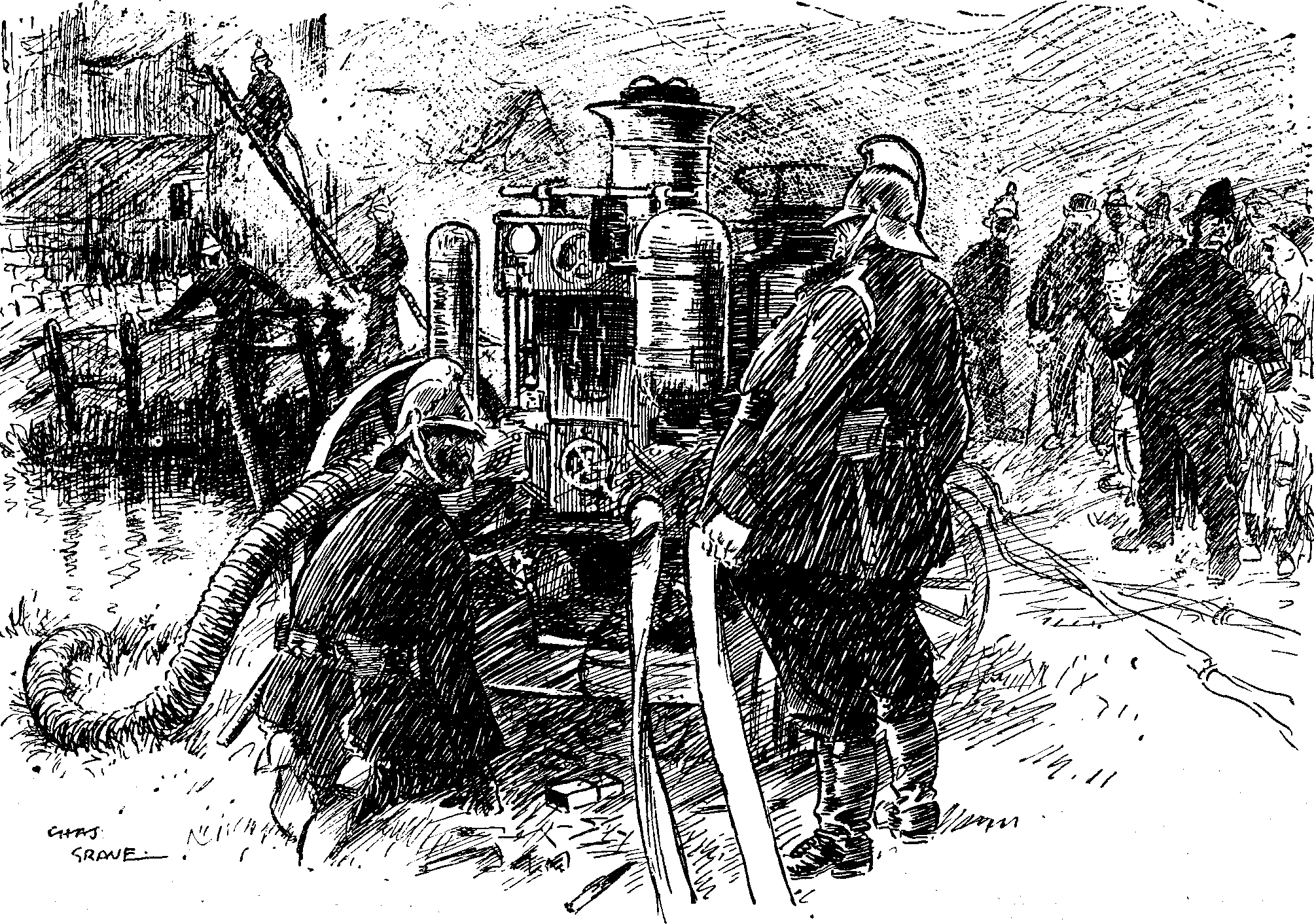 About 2 A.M. on our first day in, a figure loomed up through a snow-storm from the back of the central trench and asked forlornly if there might be any mines hereabouts. We admitted there might be, or again there might not. He questioned us precisely where it was suspected, and we told him "underneath." He scratched his head and announced that he was sent to look for it. His qualifications consisted apparently in his having coal-mined. But he seemed confident of detecting the quicker combustion sort, until he asked for necessary impedimenta. It seems that no good collier can detect an H.E. or any sort of mine without a pail of water, and a hole about 2,000 feet deep, and a pulley, and a rope ladder and a bratting-slat.