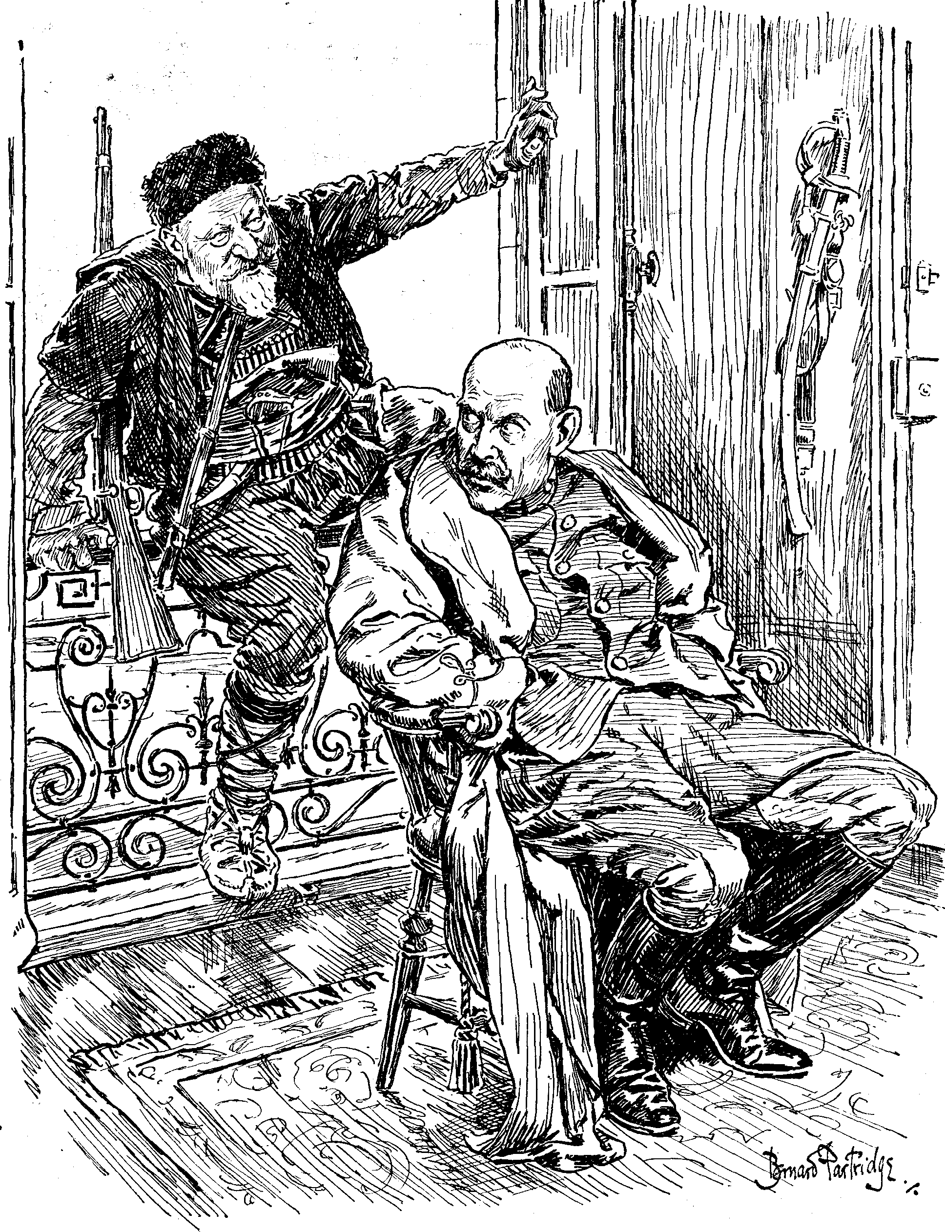 All the windows of the V.A.D. hospital were brilliantly lighted up, and through them floated the strains of a piano and occasional bursts of laughter. Number One Ward, however, was quite empty except for my friend, Private McPhee, stalking majestically up and down as if on sentry go, wearing a "fit of the blues" several sizes too large for him and an expression which would, I believe, be described by kailyard novelists as "dour."
