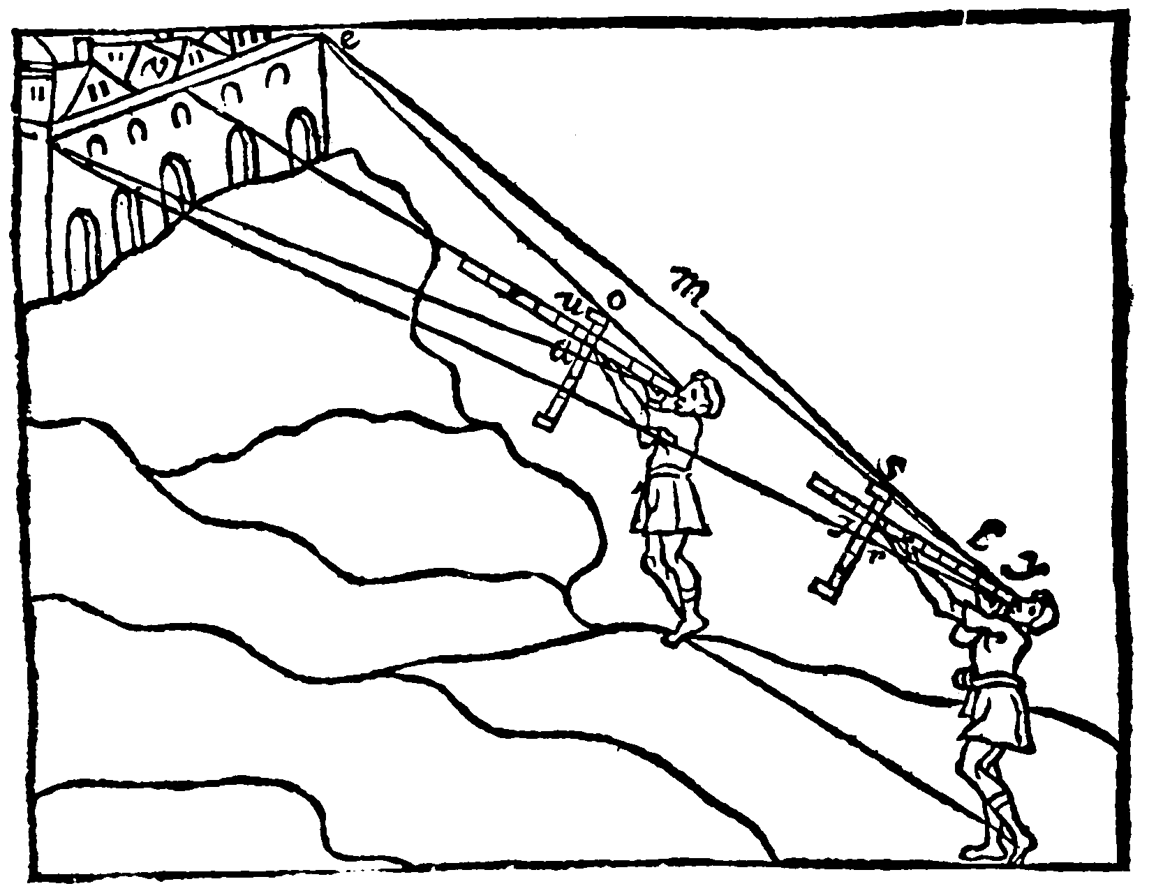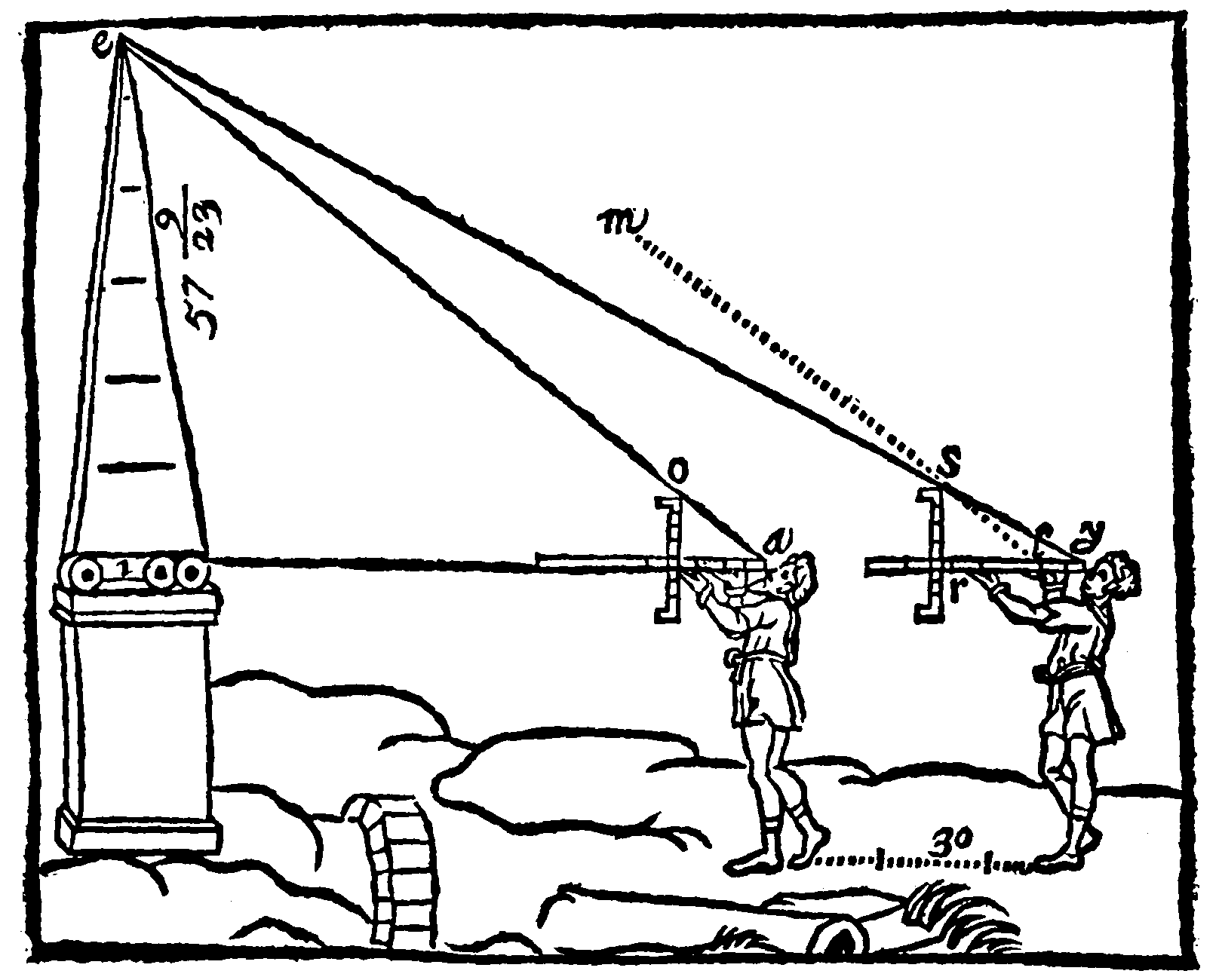 But this end of Geometry will appeare much more beautifull and glorious in the use and geometricall workes and [2]practise then by precepts, when thou shalt observe Astronomers, Geographers, Land-meaters, Sea-men, Enginers, Architects, Carpenters, Painters, and Carvers, in the description and measuring of the Starres, Countries, Lands, Engins, Seas, Buildings, Pictures, and Statues or Images to use the helpe of no other art but of Geometry. Wherefore here the name of this art commeth farre short of the thing meant by it. (For Geometria, made of Gè, which in the Greeke language signifieth the Earth; and Métron, a measure, importeth no more, but as one would say Land-measuring. And Geometra, is but Agrimensor, A land-meter: or as Tully calleth him Decempedator, a Pole-man: or as Plautus, Finitor, a Marke-man.) when as this Art teacheth not only how to measure the Land or the Earth, but the Water, and the Aire, yea and the whole World too, and in it all Bodies, Surfaces, Lines, and whatsoever else is to bee measured.