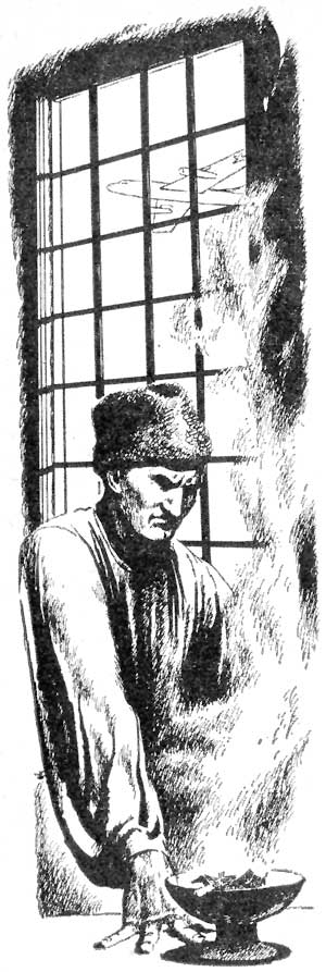 Blagonravov scowled heavily at him, put forth his fat lips in a thoughtful pout. He came to his feet, approached a file cabinet, fishing from his pocket a key ring. He unlocked the cabinet, brought forth a sheaf of papers with which he returned to his desk. He fumbled though them for a moment, found the paper he wanted and read it. He scowled again and looked up at his agent.
