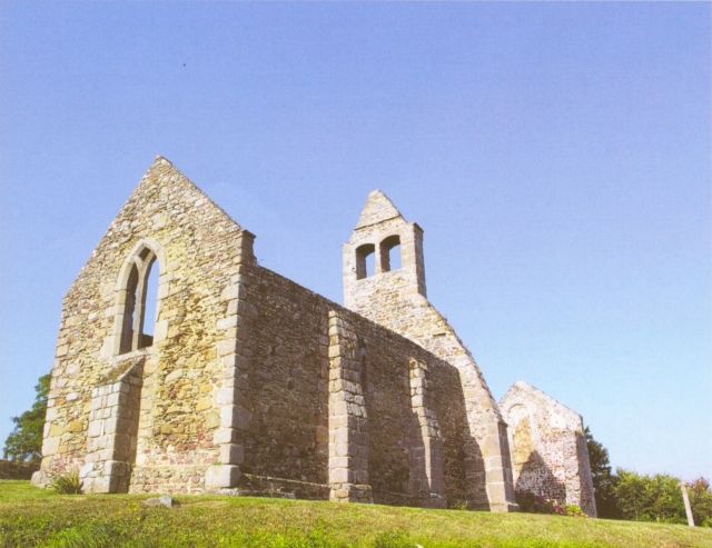 011. Saint-Martin-le-Vieux. Les ruines romanes. Entre le chœur et la nef, le double campanile (double parce que pouvant accueillir deux cloches) ajouté au seizième siècle fut édifié en granit rose de Chausey. Photo d'Alain Dermigny. [Alain-003]
