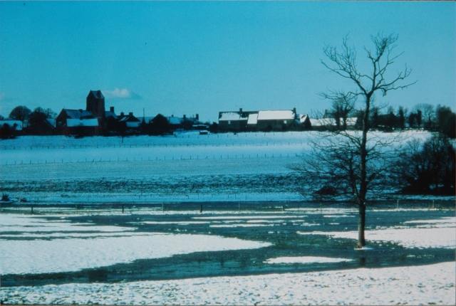 157. Saint-Léonard-de-Vains. Panorama hivernal. Le village et son prieuré roman, vus d'un peu plus près, à la fin de l'hiver. Photo d'Alain Dermigny. [Alain-085]