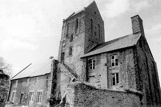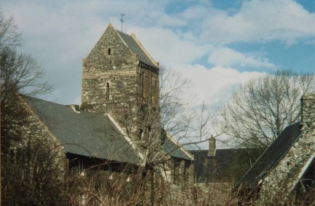 161. Saint-Léonard-de-Vains. Le prieuré est toujours une propriété privée à la fin du vingtième siècle, mais il n'est plus une ferme. En collaboration avec les Monuments historiques, le propriétaire a transformé la nef en maison d'habitation, en ouvrant des fenêtres rectangulaires et en aménageant l'intérieur. Mais, en 1985, la tour et le chœur sont encore dans un triste état. Photo d'Alain Dermigny. [Alain-086]