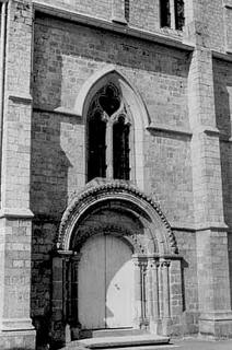 136. Genêts. L'église est formé d'une large nef, d'un transept à bras saillants et d'un chœur de trois travées à chevet plat. Une tour massive surmontée d'un toit en bâtière s'élève à la croisée du transept. Les éléments romans sont la croisée du transept, une partie des croisillons et la tour aux deux-tiers de sa hauteur. Le porche précédant le portail sud de la nef date du seizième siècle. Photo d'Alain Dermigny. [Alain-071]