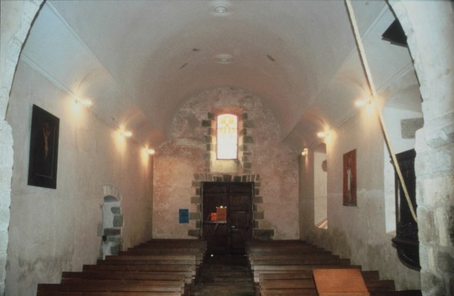 098. Saint-Jean-le-Thomas. Le chœur pré-roman (intérieur). La voûte en berceau de bois fut ajoutée en 1965 et terminée en 1973. Photo d'Alain Dermigny. [Alain-050]