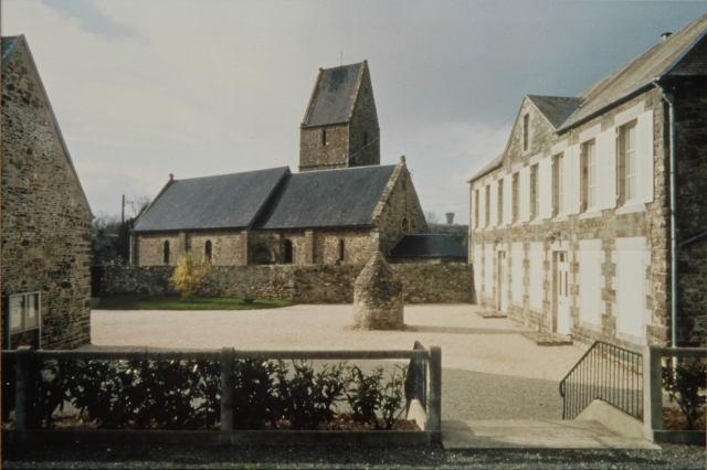 175. Saint-Loup. L'église est le seul édifice entièrement roman ayant subsisté dans la région. Construite par les seigneurs du lieu, l'église fut placée sous le vocable de Saint Loup, et le second saint est Saint Gilles. La paroisse appartenait au doyenné de Tirepied et à l'archidiachoné d'Avranches. La nef comporte trois travées. Ses murs latéraux sont épaulés chacun de quatre contreforts plats. Trois petites baies en plein-cintre sont toujours visibles, deux dans le mur sud et une dans le mur nord. Les autres baies furent percées ou agrandies par la suite. L'église fut classée monument historique en 1921. Photo d'Alain Dermigny. [Alain-093]