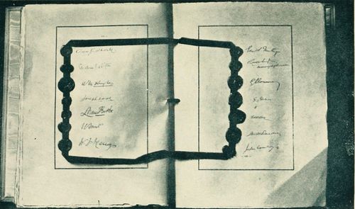 Signing the Peace Treaty in the Hall of Mirrors, Palace of Versailles, on June 28, 1919. Georges Clemenceau, French Premier, is standing and inviting the German delegates to affix their signatures to the document.
