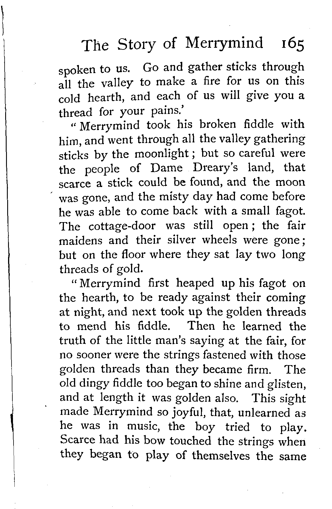 One has not far to read to discover the secret of its popularity with children. It is full of word-pictures, of picturesque settings. Her power of visualisation is shown in these fairy-tales more, perhaps, than in any [Pg xv] other of her writings. Truly, she was fortunate in having the Irish fairies to lead her into their gossamer-strewn ways, to touch her fancy with their magic, and put upon her the glamour of their land. When the stories are of them she is, perhaps, at her best; but each story in the book makes a complete picture, each has enough and no more of colour and scene. And the little pictures are kept in their places, pinned down to reality, by delightful touches of humour. Of the wonderful chair Dame Frostyface says in the beginning of the story, "It was made by a cunning fairy who lived in the forest when I was young, and she gave it to me because she knew nobody would keep what they got hold of better."