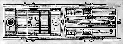 La seconde partie de la machine porte, comme nous l'avons dit, la chaudière et tout ce qui la constitue. De longues tiges, placées sous la main du mécanicien, correspondent au manchon d'embrayage, et donnent le moyen d'opérer toutes les transformations de vitesse, de mouvement et de puissance inhérentes au système.