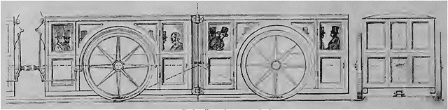 Les wagons se composent de deux demi-wagons réunis par deux articulations ou par des espèces de verrous situés l'un au dessus de l'autre, suivant la même verticale, et qui leur permettent un mouvement rotatif horizontal. Chacun de ces demi-wagons (fig. 3) porte une paire de roues de grand diamètre tournant librement sur les fusées des essieux. Ainsi, on le voit, il y a parfaite indépendance d'une part entre les roues des deux demi-wagons et d'autre part entre les deux roues, du même demi-wagon. Pour éviter le renversement des wagons, soit dans le cas du bris d'un essieu, soit par l'effet de la force centrifuge dans le parcours des courbes à grande vitesse, le centre de gravité des wagons se trouve à peu près à la hauteur des essieux, et les essieux traversent de part en part le wagon. Cette disposition a permis d'augmenter le diamètre des roues, qui, dans ce cas, et grâce à la largeur de la voie, sont extérieures aux wagons, au lieu d'être placées en dessous, comme dans le système actuel. La comparaison des figures 3 et 4 indique suffisamment cette différence de construction pour que nous n'ayons pas besoin d'insister davantage à cet égard.