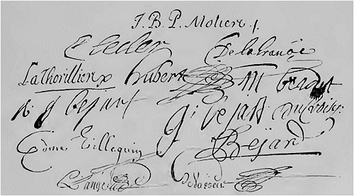 Furent présents Jean-Baptiste-Poquelin de Molière; damoiselle Claire-Gresinde Béjard, sa femme, de lui autorisée; damoiselle Madeleine Béjard, fille majeure; Edmé Villequin, sieur de Brie; damoiselle Catherine Leclerc, sa femme, de lui autorisée; demoiselle Geneviève-Béjard de La Villaubrun, demeurant place du Palais-Royal; Charles Varlet de La Grange, demeurant rue Saint-Honoré; Philibert-Cazeau, sieur Du Croisy, demeurant susdite rue; François-Lenoir, sieur de La Thorillière; et André Hubert, demeurant aussi rue Saint-Honoré, ès même paroisse Saint-Germain-Dauxerrois;