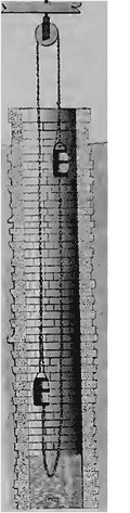 III. Lorsqu'on puise de l'eau dans un puits, lorsqu'on exploite une carrière ou une mine à l'aide d'une corde ou d'une chaîne munie d'un seau ou d'une benne à chacune de ses extrémités, il y a à chaque instant une perte de force considérable, due à ce que l'on a à soulever le poids de la chaîne ou de la corde, outre celui de la matière contenue dans le seau. Quand il s'agit de mines ou de carrières de plusieurs centaines de mètres de profondeur, le poids inutile à soulever, lorsque le seau est au fond du puits, peut être très-considérable par rapport au poids réellement utile.