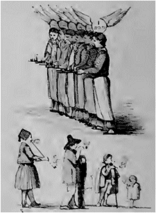 Mais bientôt l'institution du tour s'est trouvée attaquée de plus d'un côté. Nos lecteurs savaient sans doute se rendre compte du tour avant que le dessin qui accompagne cet article l'eût mis sous leurs yeux; nous l'avons cependant regardé comme nécessaire, et nous croyons devoir ajouter que le tour est un cylindre en bois convexe d'un côté et concave de l'autre, tournant sur lui-même. Le côté convexe fait face à une rue, l'autre s'ouvre dans l'intérieur d'une salle de l'hospice: une sonnette est placée auprès à l'extérieur. Une femme veut-elle exposer un nouveau-né, elle avertit la personne de garde par un coup de sonnette. Aussitôt le cylindre, décrivant un demi-cercle, présente au dehors, sur la rue, son côté vide, reçoit le nouveau-né, et l'apporte dans l'intérieur de l'hospice en achevant son évolution. Ainsi la personne qui dépose l'enfant n'a été vue par aucun des servants de la maison, et elle aura pris ses mesures pour n'être pas aperçue des passants. Son secret sera donc bien gardé, en même temps que le petit abandonné ne sera point exposé aux intempéries de l'air.