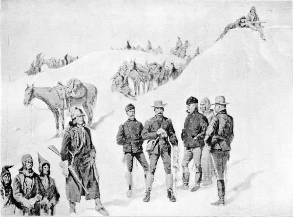 Before accepting an invitation to accompany an Indian commission into the Northwest I had asked the general quietly if this was a “horseback” or a “wagon outfit.” He had assured me that he was not a “wagon man,” and I indeed had heard before that he was not. There is always a distinction in the army between wagon men and men who go without wagons by transporting their supplies on pack animals. The wagon men have always acquired more reputation as travellers than Indian fighters. In a trip to the Pine Ridge Agency I had discovered that General Miles was not committed to any strained theory[2] of how mounted men should be moved. Any settled purpose he might have about his movements were all locked up in a desperate desire to “get thar.” Being a little late in leaving a point on the railroad, I rode along with Lieutenant Guilfoil, of the Ninth, and we moved at a gentle trot. Presently we met a citizen in a wagon, and he, upon observing the lieutenant in uniform, pulled up his team and excitedly inquired,